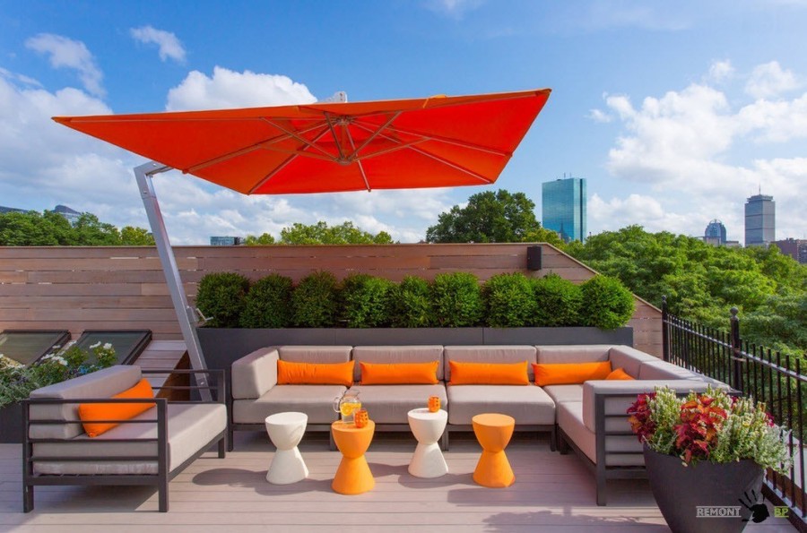 Удобная зона отдыха, представленная садовой мебелью на металлических каркасах с мягкими съемными сиденьями и спинками, так же обустроилась в тени большого яркого зонта. Насыщенный апельсиновый цвет тента был повторен не только в диванных подушках, но и исполнении оригинальных столиков-подставок.
