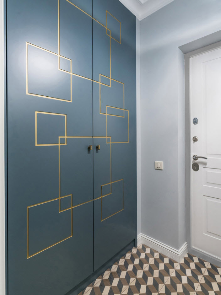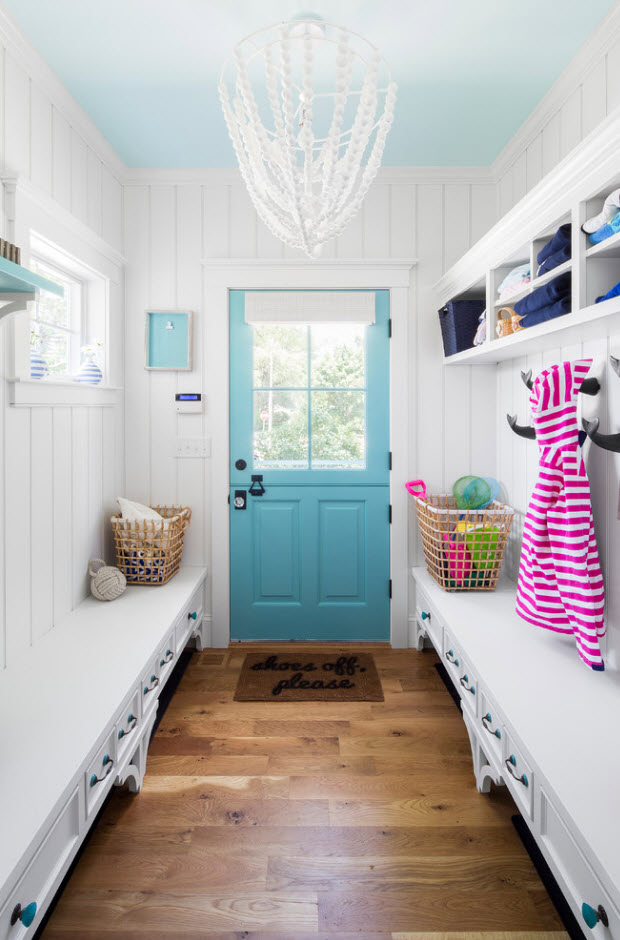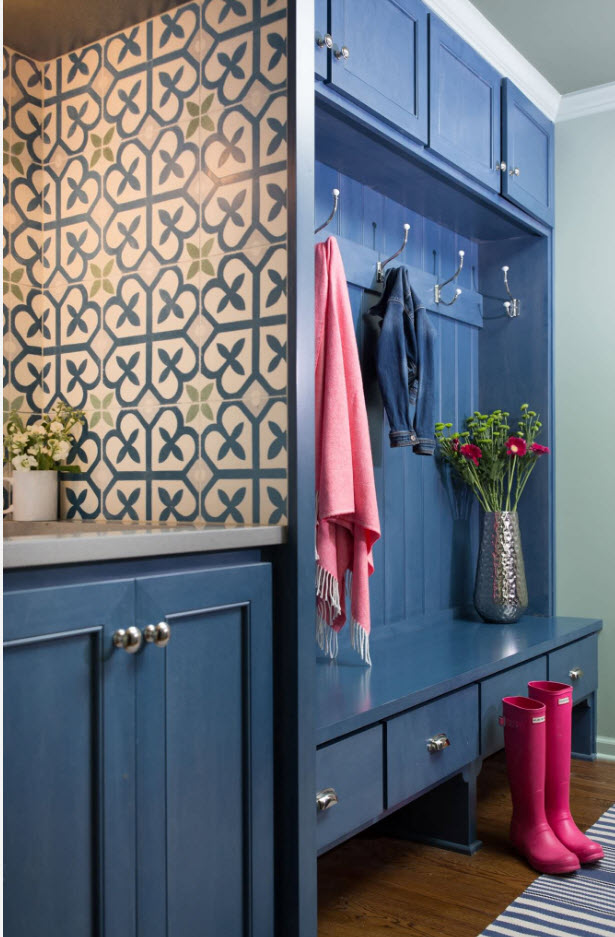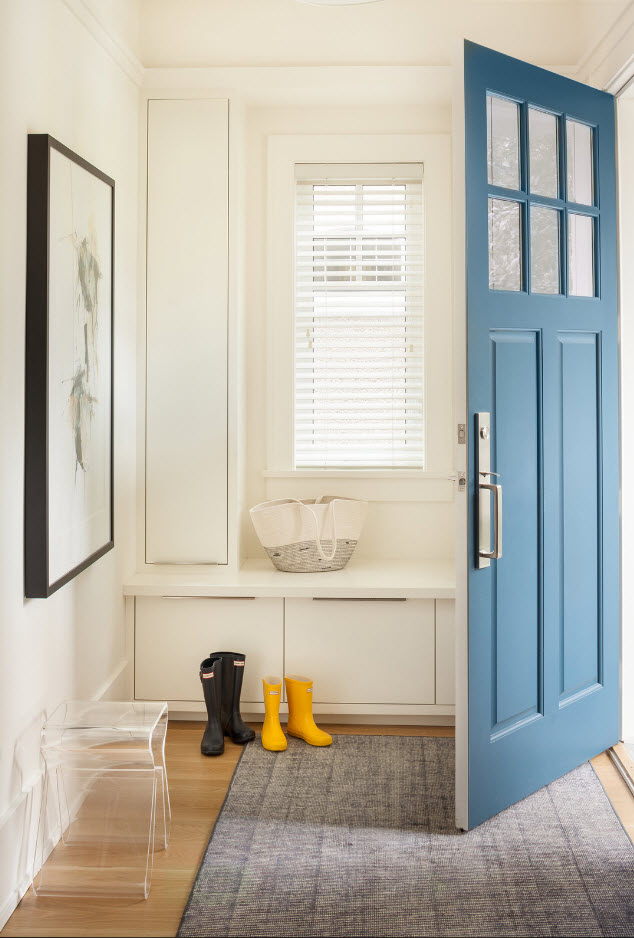 Если ваша прихожая находится в частном доме или квартире с улучшенной планировкой и может похвастать большой площадью, то выбор цвета для исполнения меблировки невероятно велик. В новом сезоне популярными будут сложные оттенки синего цвета. Красивые тона синего можно применять как в отделке, так и меблировке комнат. Но для прихожих логичнее оставить отделку стен светлым оттенкам, а колоритную цветовую гамму использовать для систем хранения.