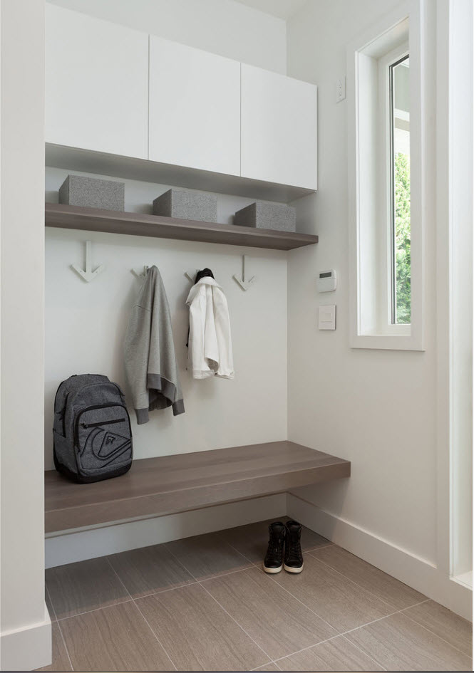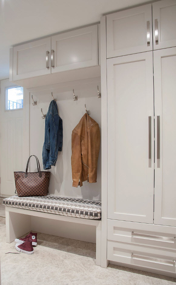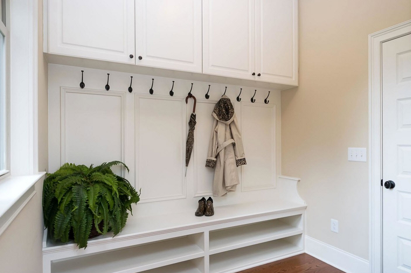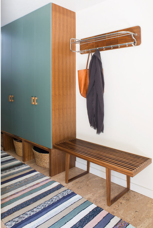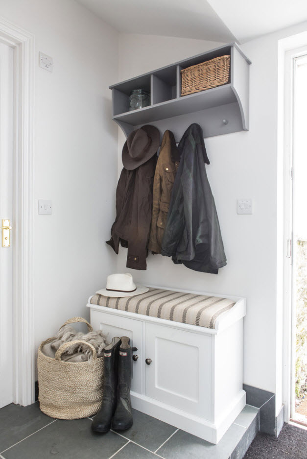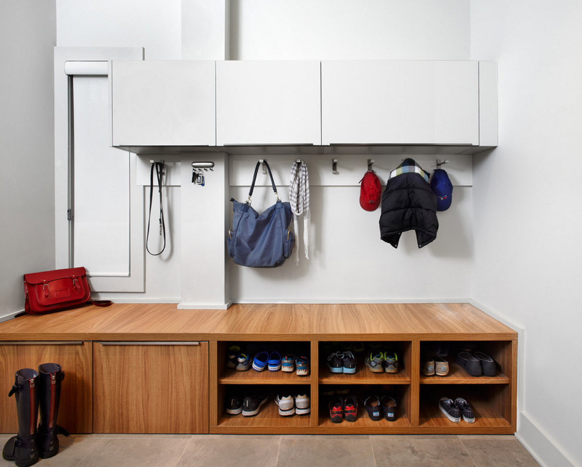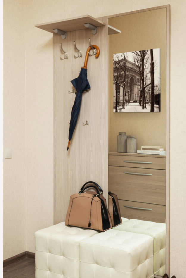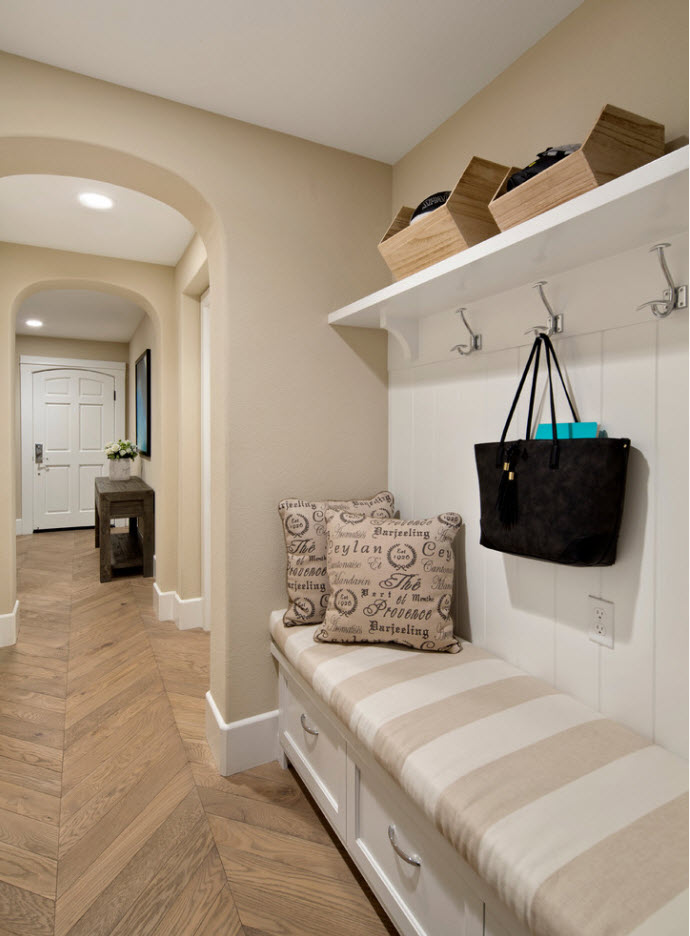 Если пространство прихожей позволяет, то под вешалкой удобно будет установить небольшую банкетку или встроенное сиденье. Мягкая обивка позволит с удобством переобуваться, а пространство под банкеткой можно использовать для установки обуви. При такой планировке вы можете быть уверенными в том, что каждый сантиметр прихожей используется рационально.