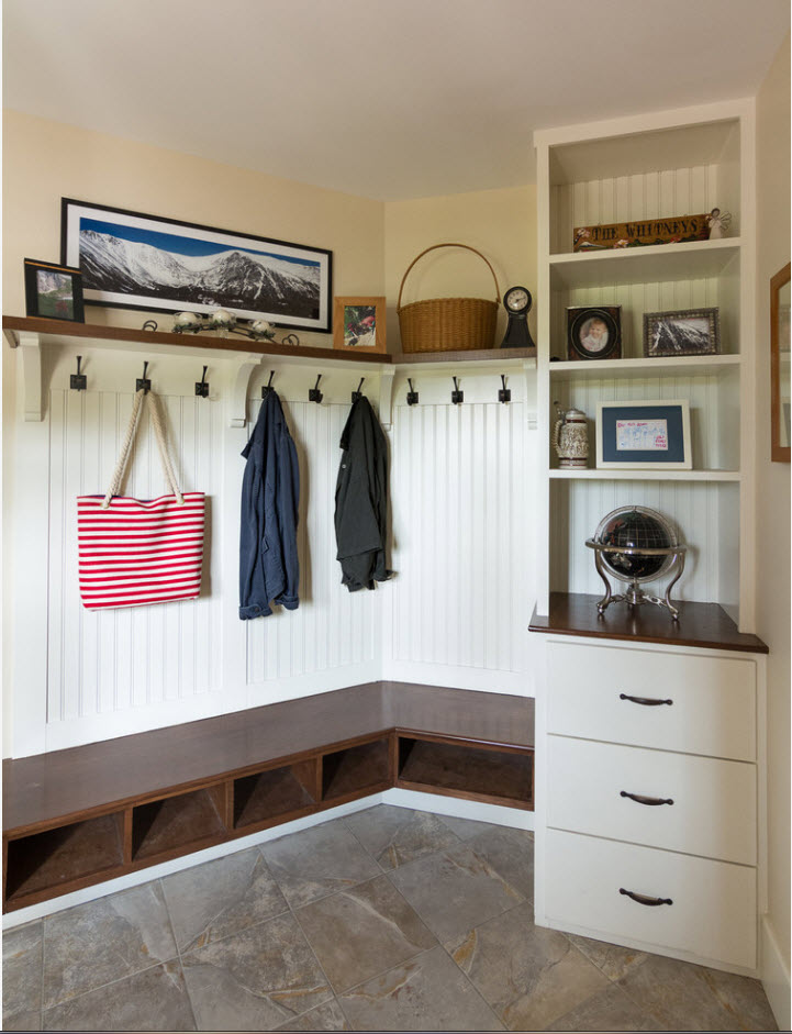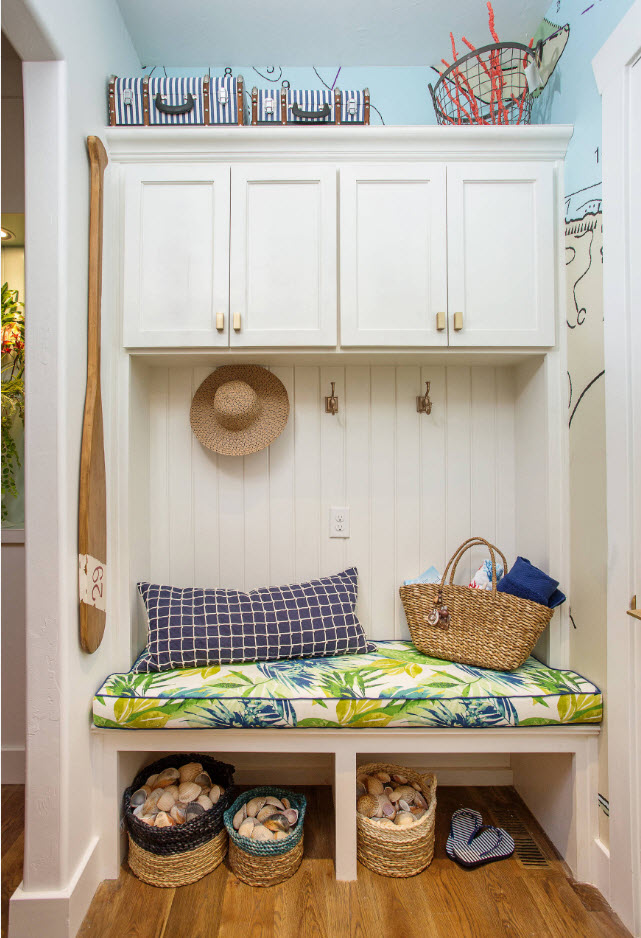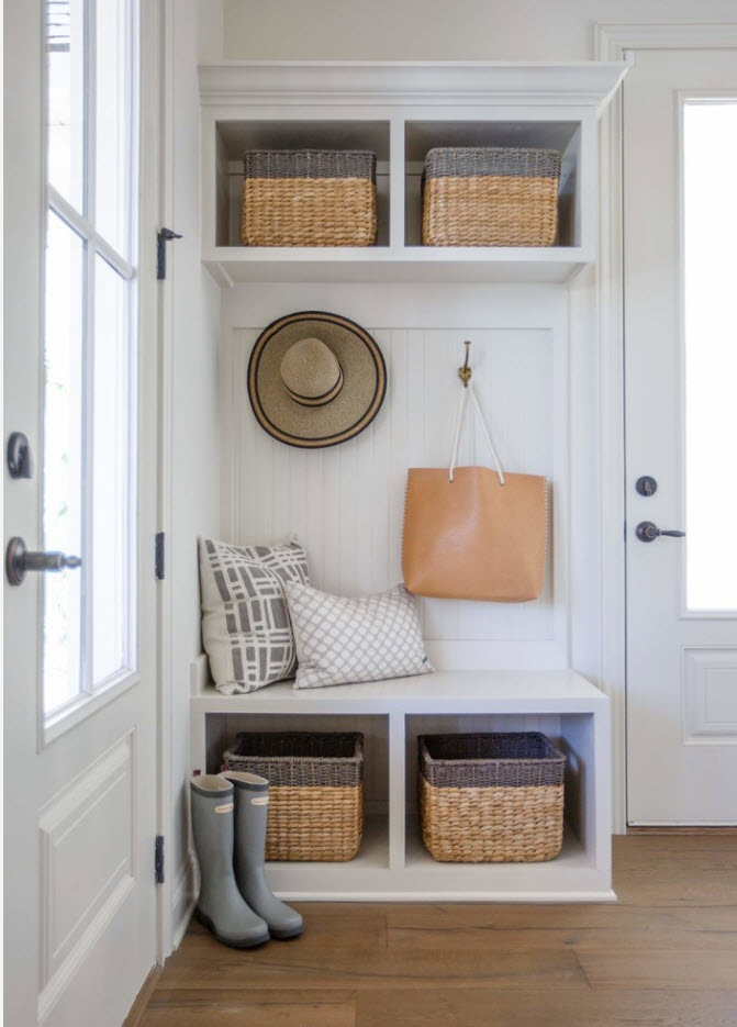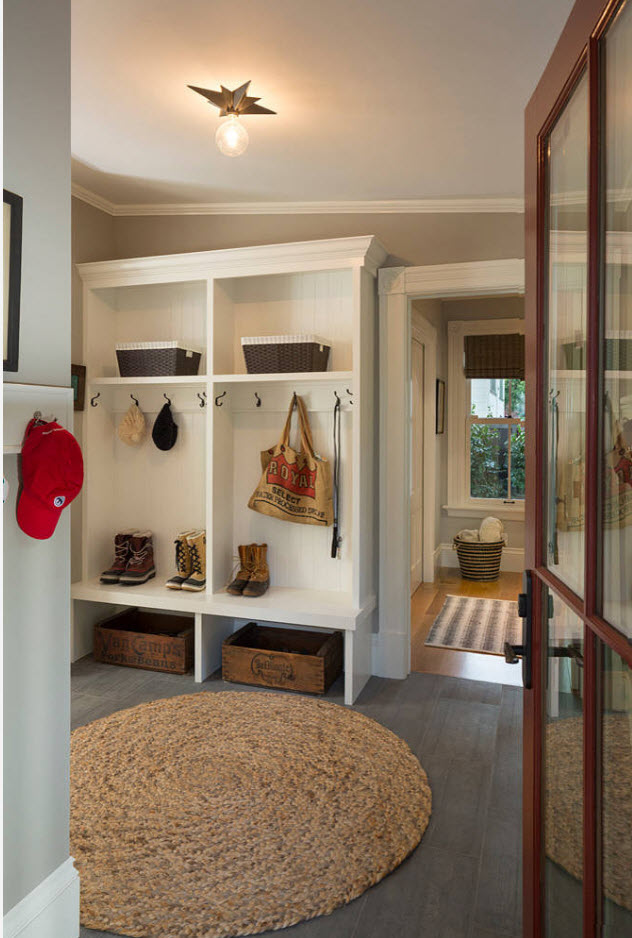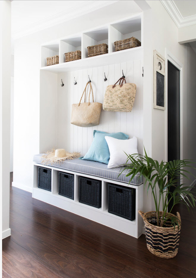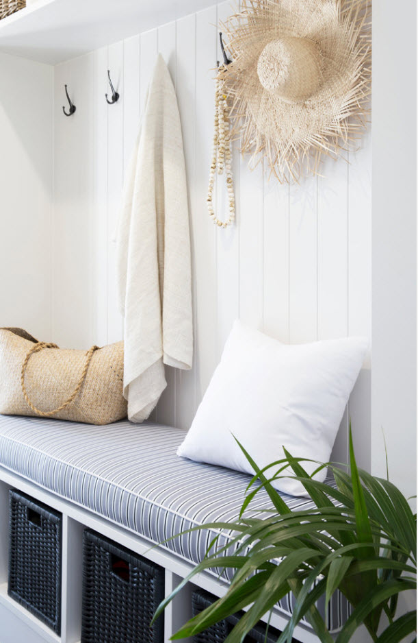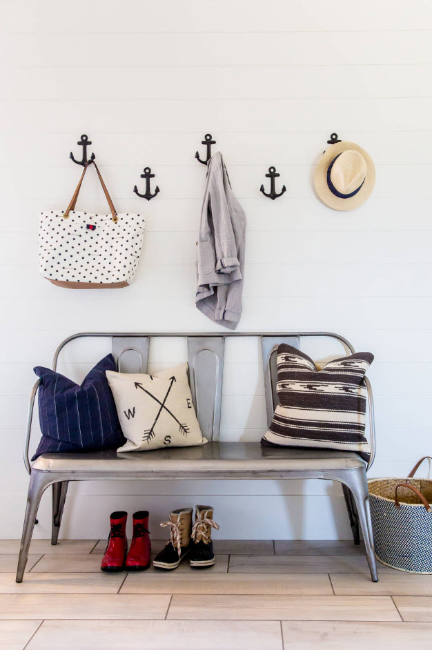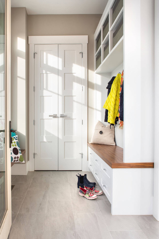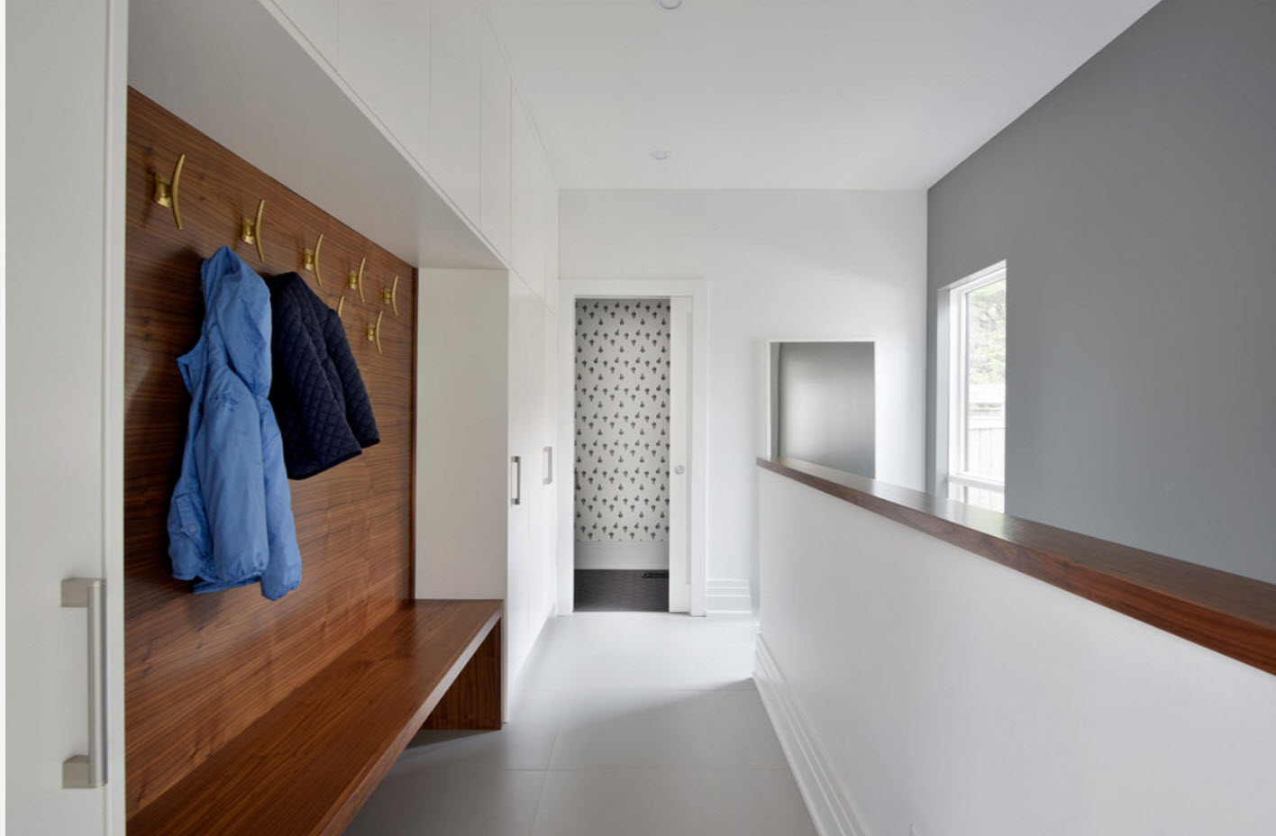 Если пространство прихожей позволяет, то под вешалкой удобно будет установить небольшую банкетку или встроенное сиденье. Мягкая обивка позволит с удобством переобуваться, а пространство под банкеткой можно использовать для установки обуви. При такой планировке вы можете быть уверенными в том, что каждый сантиметр прихожей используется рационально.
