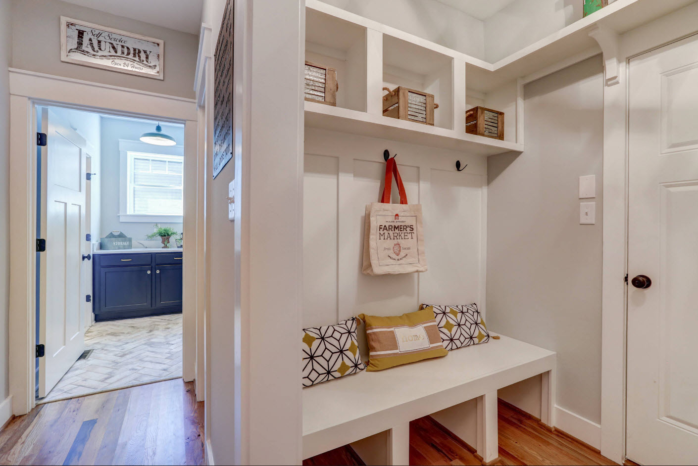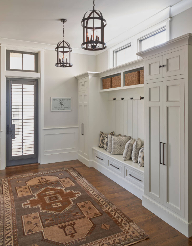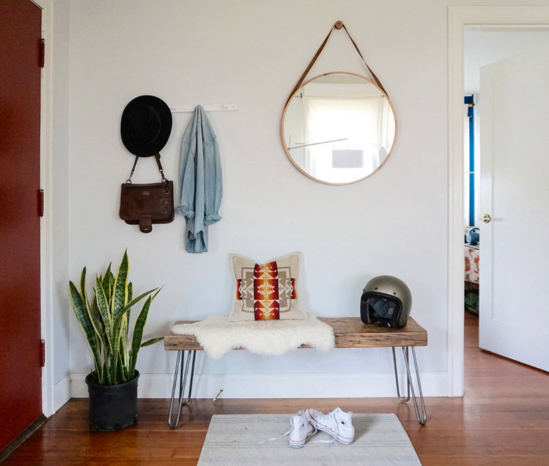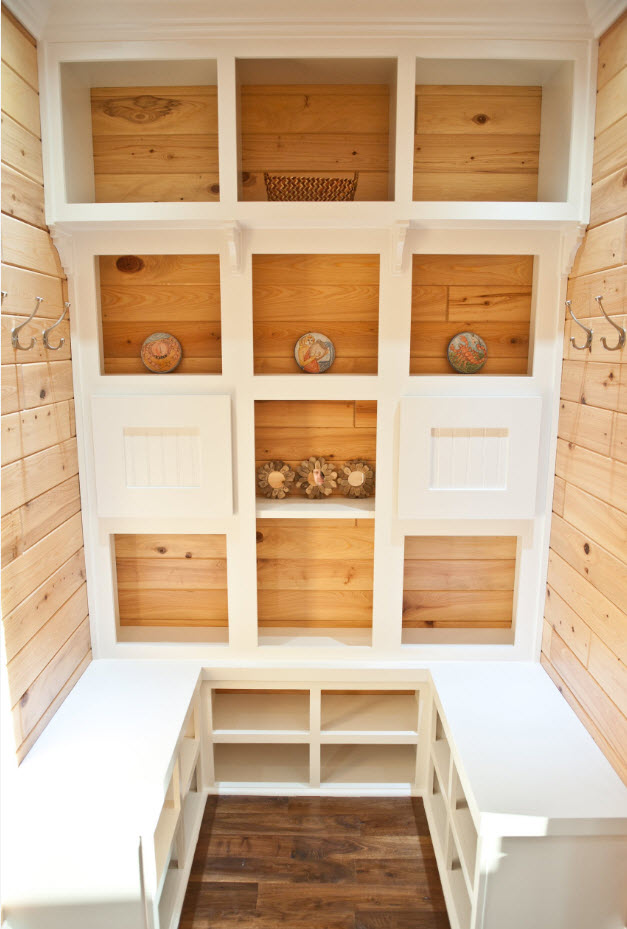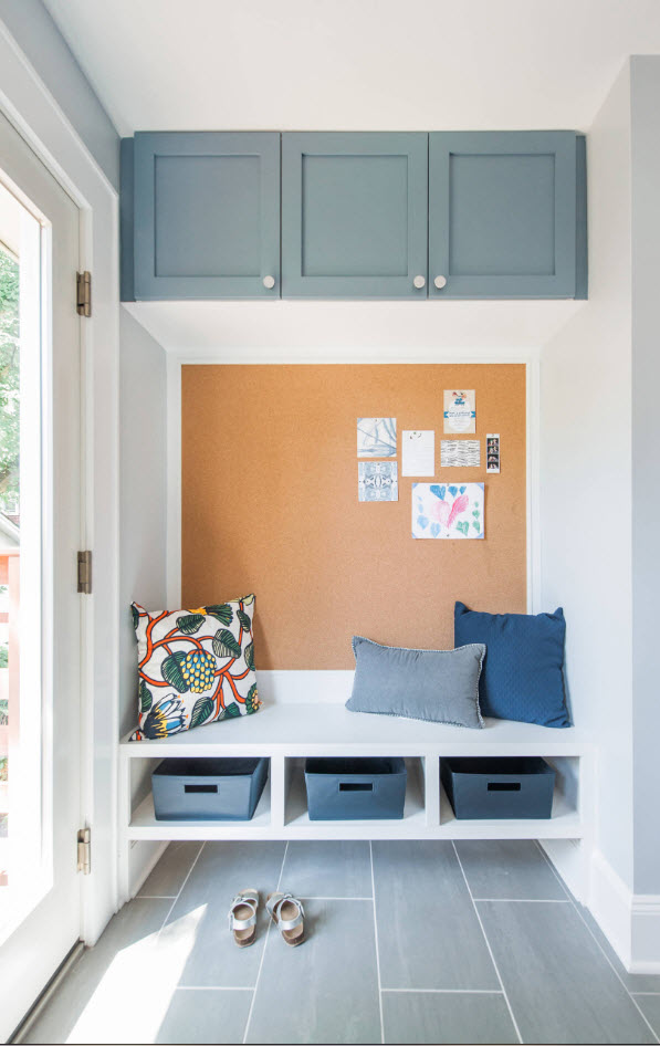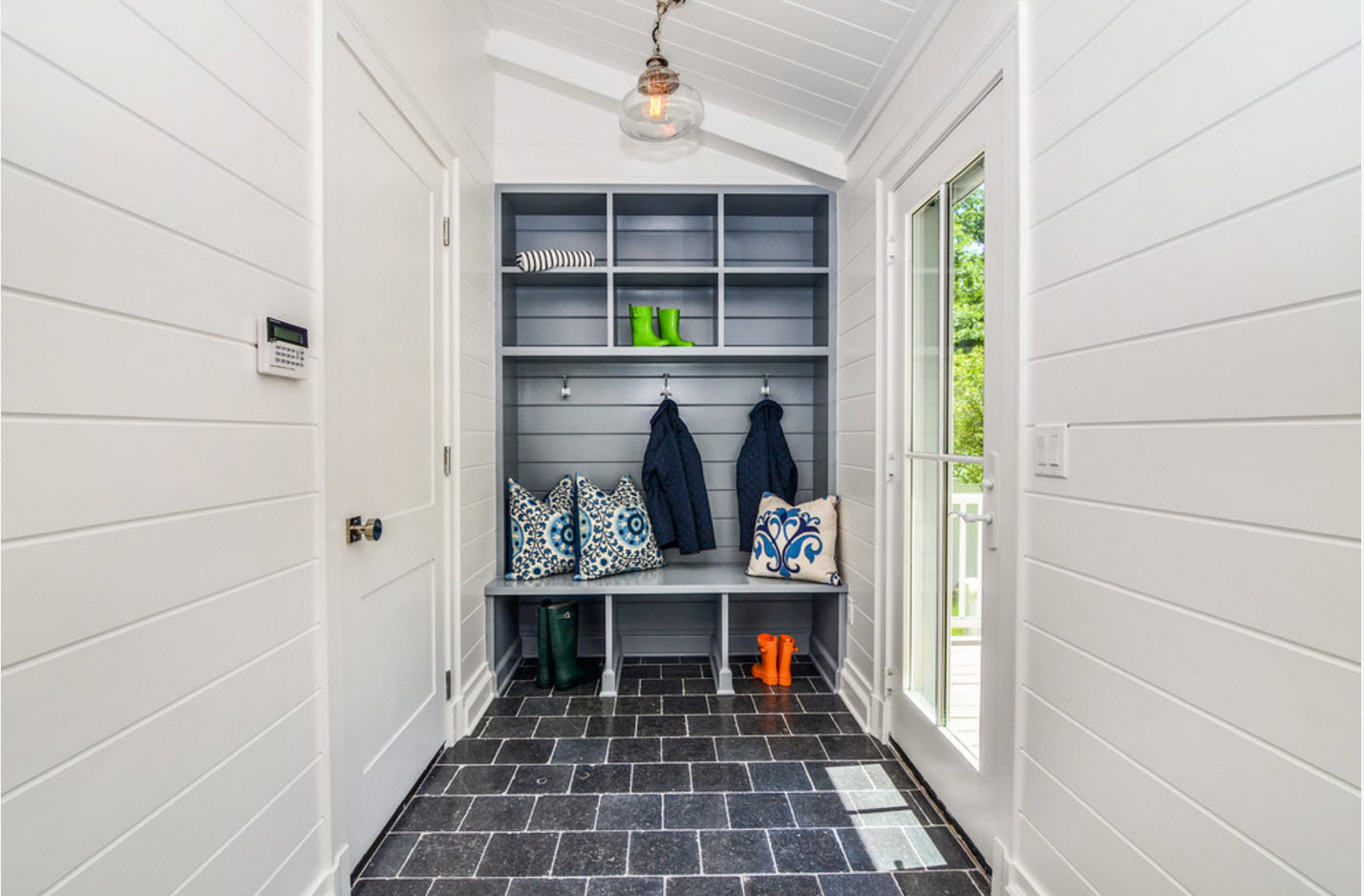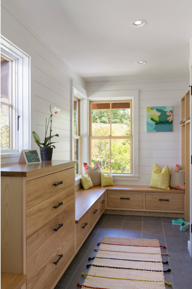 Если пространство прихожей позволяет, то под вешалкой удобно будет установить небольшую банкетку или встроенное сиденье. Мягкая обивка позволит с удобством переобуваться, а пространство под банкеткой можно использовать для установки обуви. При такой планировке вы можете быть уверенными в том, что каждый сантиметр прихожей используется рационально.