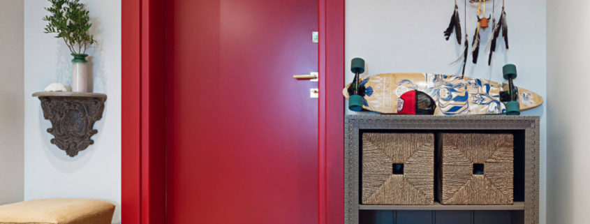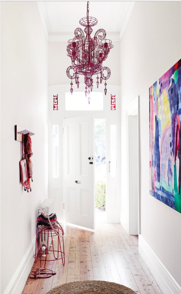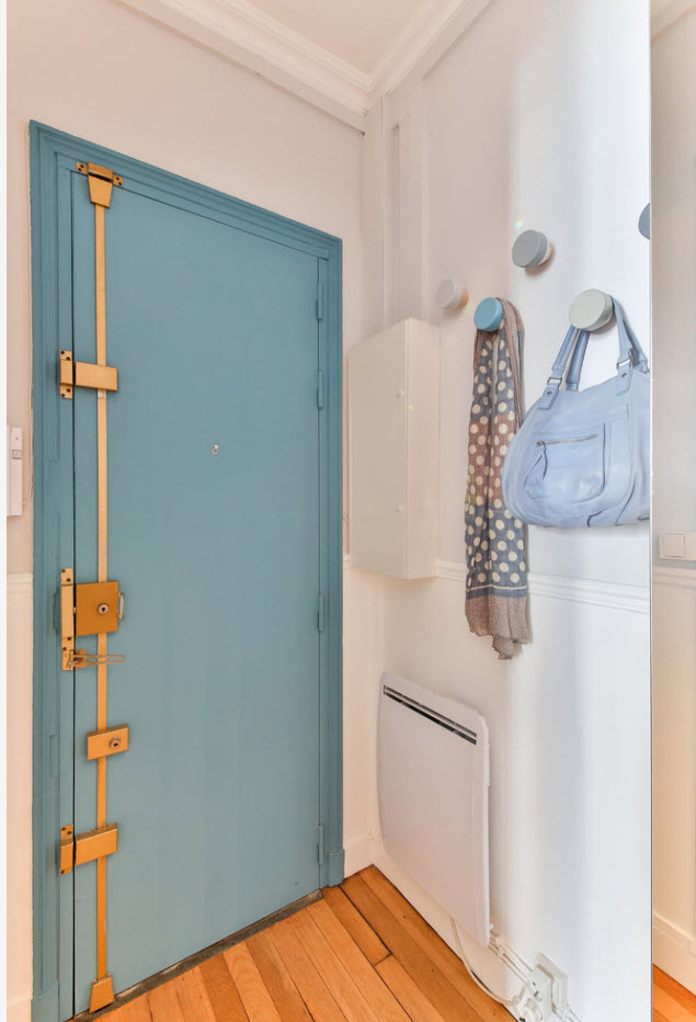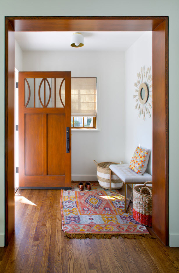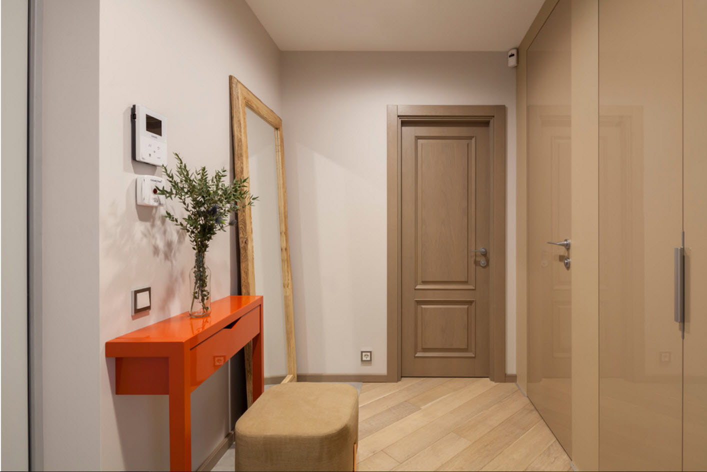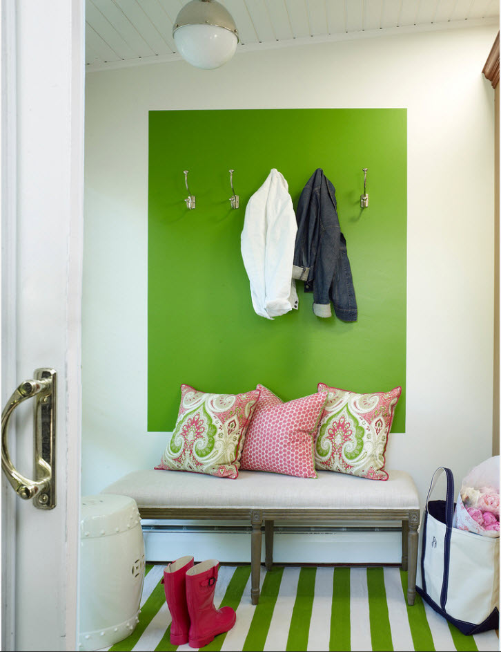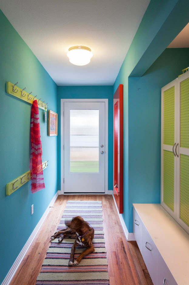 В помещении с малой площадью в качестве декоративного элемента можно использовать яркий цвет. Если все пространство оформлено в светлых, нейтральных тонах, то достаточно всего лишь одного колоритного элемента интерьера, чтобы кардинальным образом изменить характер и настроение прихожей. Это может быть часть отделки, входная дверь или яркая вешалка, пуфик для обувания или корзина для зонтиков.