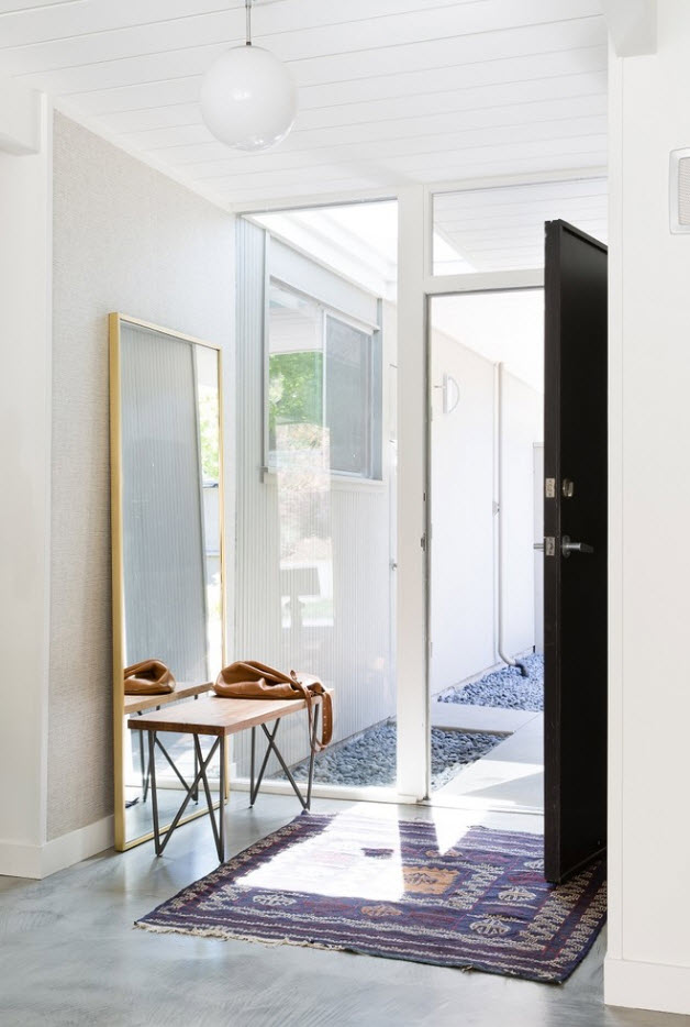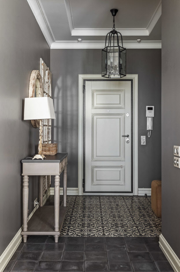 Начнем с потолка. В прихожей его не ожидают вредные воздействия, поэтому существенных ограничений на выбор отделочных материалов не существует. Но специалисты рекомендуют выбирать самые простые и универсальные решения для составления современного дизайна. Идеально гладкий белый потолок – залог успеха в оформлении прихожей. Сложные двухуровневые конструкции навесных потолков, рельефный декор или яркий тон – не подходящий вариант для помещения малых размеров. Для того чтобы переход в остальные помещения из прихожей (а в некоторых квартирах именно это утилитарное помещение является входом абсолютно во все другие комнаты) был плавным, органичным, вся отделка этого пространства должна быть нейтральной.