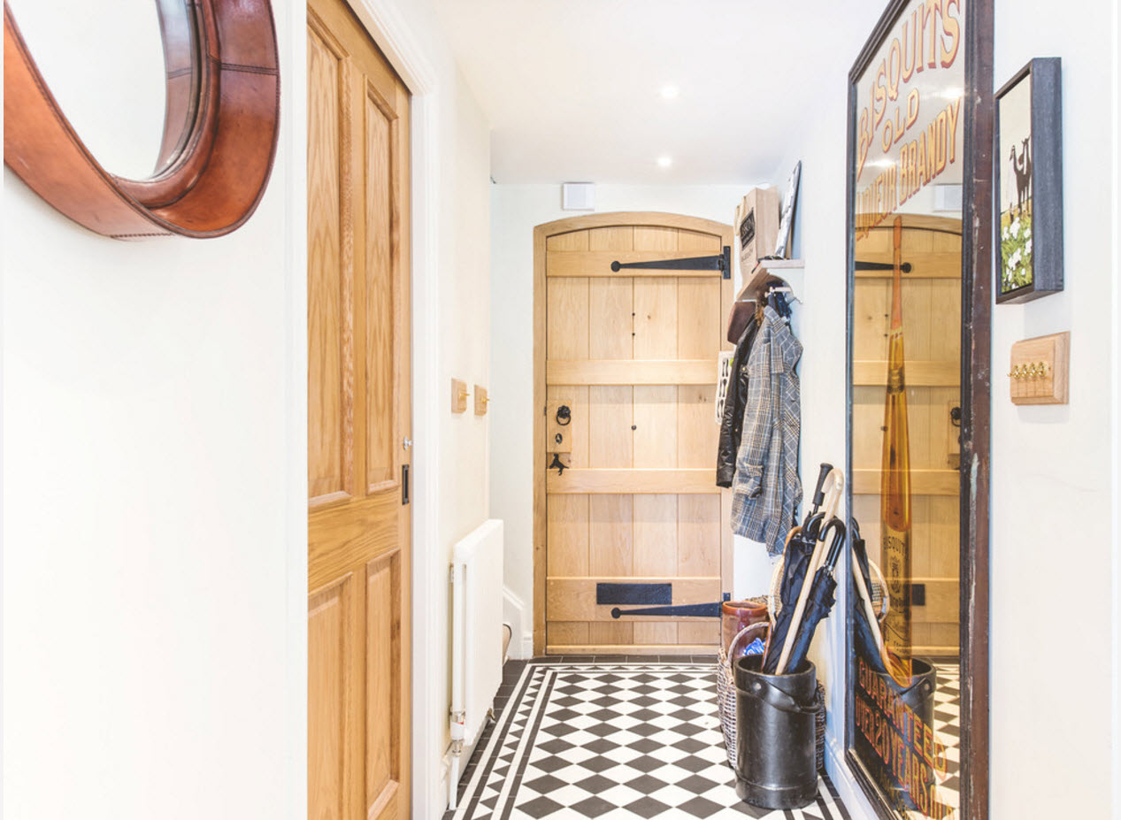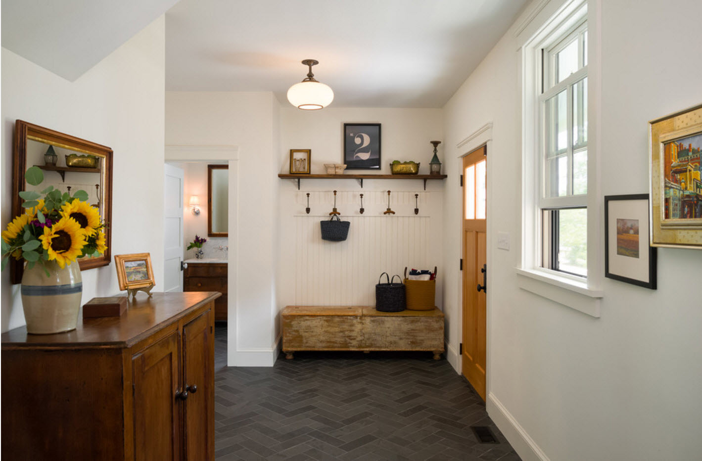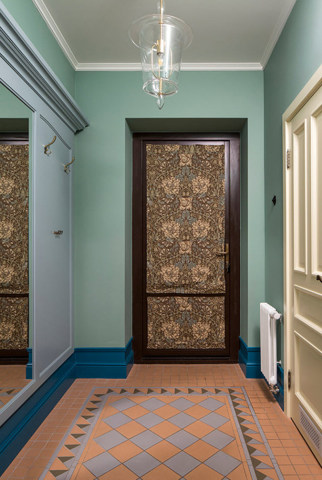 В частном доме лучше выполнить всю отделку пола прихожей при помощи керамической плитки. А в интерьере квартиры можно прибегнуть к комбинированию – пространство у входной двери оформить керамикой, а далее постелить ламинат, паркетную доску или линолеум, сочетающиеся по цветовому решению. Также дизайнеры рекомендуют использовать плитку в качестве материала для создания так называемой плинтус-панели. На стену (для защиты от влаги и грязи) в один ряд приклеивается керамическая плитка, чаще всего та же, что использовалась для создания напольного покрытия.