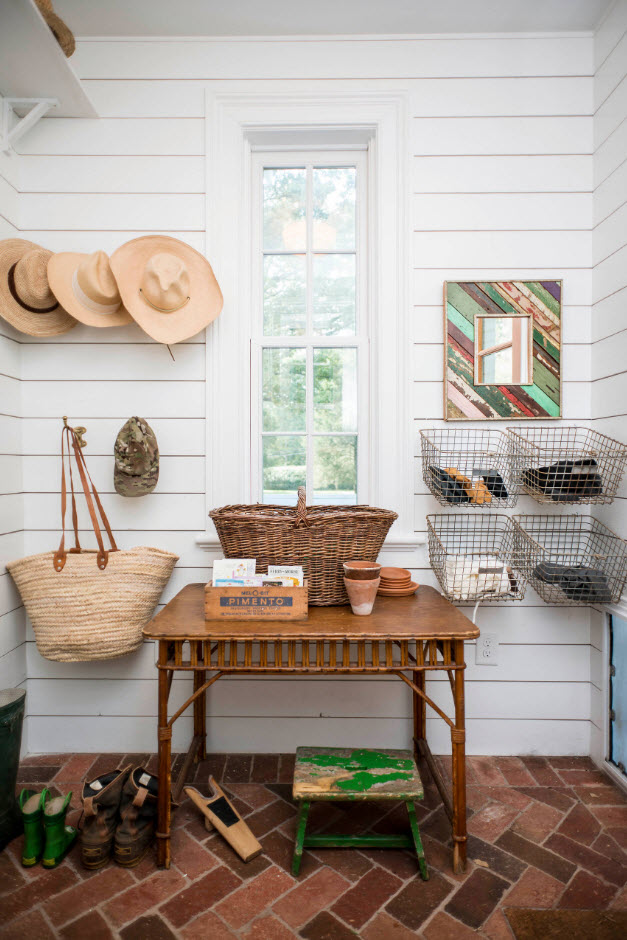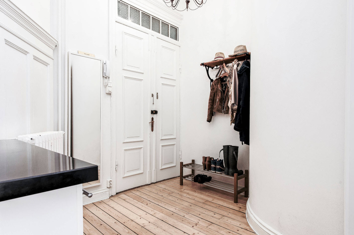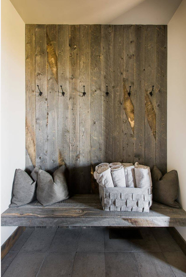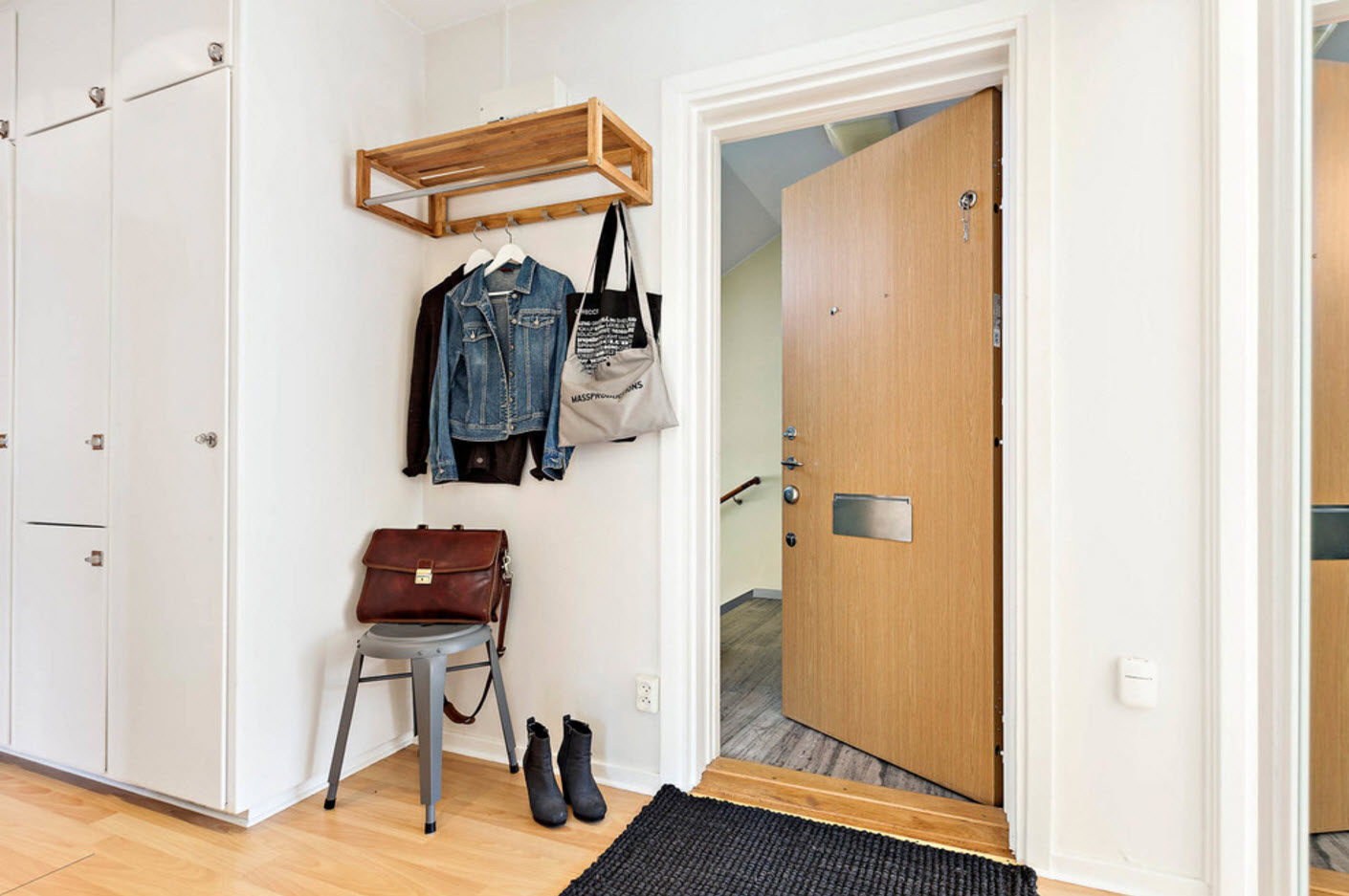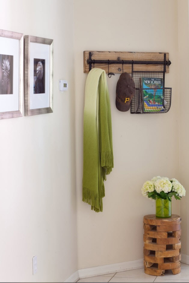 Если пространство прихожей не позволяет встраивать системы хранения, то необходимо позаботиться, по крайней мере, о достаточном количестве вешалок. Это могут быть обычные крючки, которые крепятся к стенам – в этом случае необходимо позаботиться о защите поверхностей от влаги, которая может быть принесена с улицы на верхней одежде. В этом случае оптимальным вариантом отделки станут стеновые панели. Если же вешалки крепятся к ламинированной поверхности или нескольким рейкам, то меры по защите стен можно ослабить и использовать виниловые или жидкие обои, декоративную штукатурку.