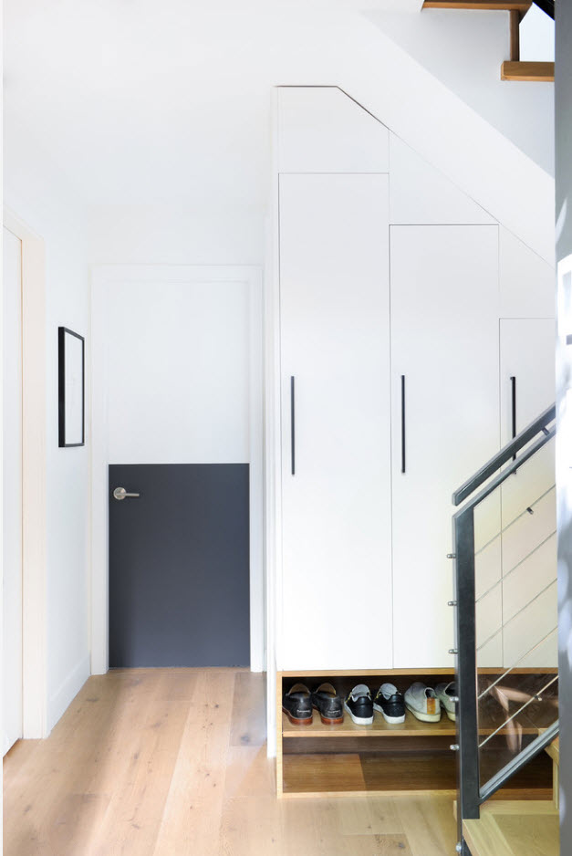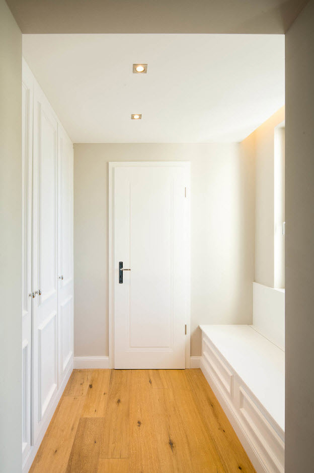 Еще один универсальный вариант исполнения мебели для небольших помещений – белый цвет. Если стены прихожей оформлены в пастельных тонах, то белоснежная мебель гармонично вольется в создание легкого и элегантного образа. К тому же, при встраивании систем хранения от пола до самого потолка, получается весьма масштабная конструкция. Белый тон поможет снизить до минимума ощущение массивности, монументальности.