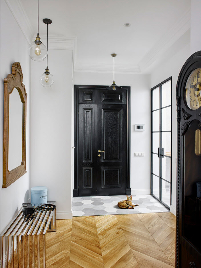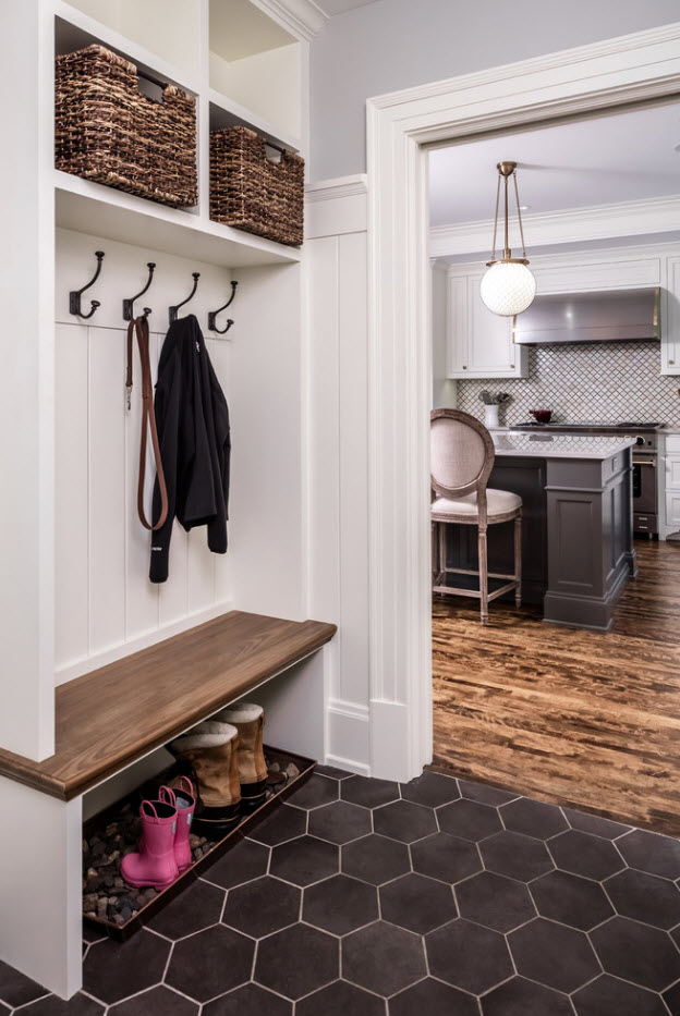 Если говорить об оформлении прихожей с точки зрения практичности и простоты эксплуатации и ухода, то первым и неотложным правилом является использование влагостойких материалов, за которыми несложно ухаживать. Также необходимо учитывать высокий риск механических повреждений, учитывая, что прихожая принимает на себя не только влагу и грязь с наших подошв, но и вес крупногабаритных покупок, следы от шпилек и каблуков, падение зонтиков, роликов и даже санок. В большей степени эти виды повреждений обуславливают выбор напольного покрытия.
