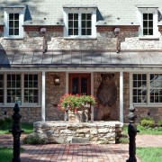 Кухонное пространство буквально залито солнечным светом, благодаря стеклянному потолку над обеденной зоной, стене и большим прозрачным раздвижным дверям, ведущим на задний двор. Использование необработанной кирпичной стены в качестве акцента, позволяет привнести в интерьер кухонного пространства некоторую брутальность и мотивы индустриальной стилистики. Сочетание деревянных, стеклянных и кирпичных поверхностей с применением современного глянца в меблировке позволило создать нетривиальный, но при этом невероятно практичный дизайн кухни.