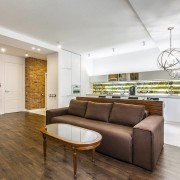 Пространство гостиной распространяется на две смежные комнаты, одна из которых находится на некотором возвышении по отношению к другой. Объединяющим элементом интерьера стала отделка – нейтральные цвета стен и белоснежный потолок выступают контрастом яркому паркетному полу. Использование паркетного рисунка «ёлочкой» из древесины с различным природным рисунком стало фокусным элементом дизайна. Немногочисленная, но оригинальная меблировка гостиной способствует сохранения большого количества пространства свободным.
