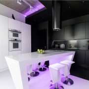 Большой кухонный остров претерпел интеграцию не только систем хранения и рабочих поверхностей, но и двух раковин и варочной панели, освободив тем самым однорядную компоновку гарнитура от этих функциональных секторов. Не последнюю роль в формировании интерьера практичной, но элегантной кухни играет осветительная система. Оригинальная люстра над рабочей поверхностью и встроенная подсветка стеллажей позволяют не только обеспечить помещение достаточным уровнем освещенности в темное время суток, но и создать определенную атмосферу функционального пространства.