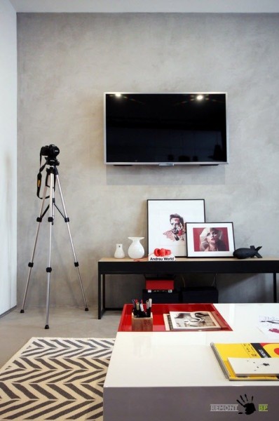 Чередование белого, черного и красного тонов в оформлении апартаментов, не дает взору заскучать и способствует фокусировке на тех или иных предметах интерьера, особенностях отделки или элементах декора.