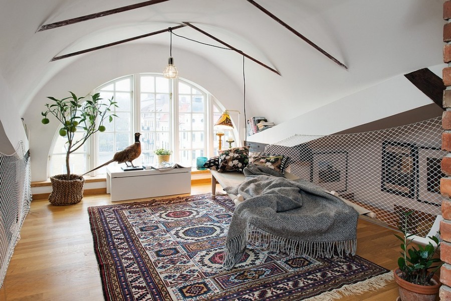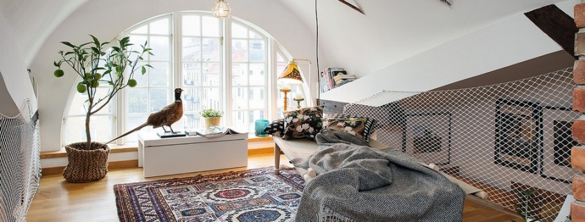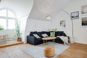 Оригинальное оформление арочного окна делает дизайн всей комнаты уникальным. Шведские апартаменты относятся к тому виду дизайн-проектов, когда сложные особенности архитектуры становятся изюминками здания, что называется «вишенкой на торте».