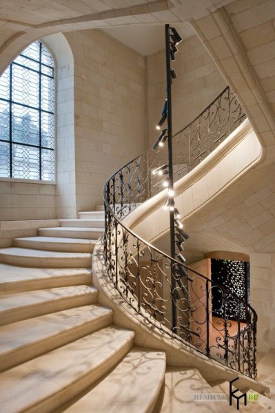 На второй этаж ведет довольно крутая винтообразная лестница, выложенная светлым кирпичом. При подъеме наверх можно воспользоваться коваными перилами с изысканным растительным орнаментом. Свет падает на лестничную площадку через аркообразное окно, прикрытое тонкой решеткой. В темное время суток эта зона освещается с помощью оригинальных светильников, подвешенных к высокой металлической стойке.