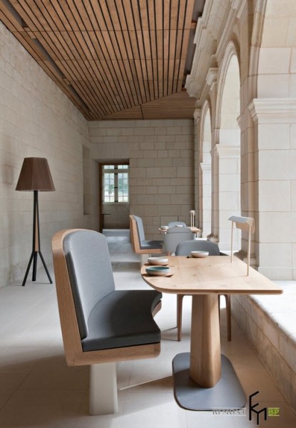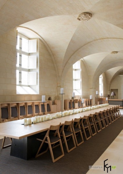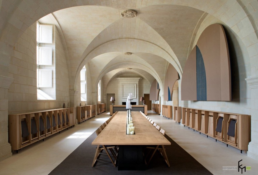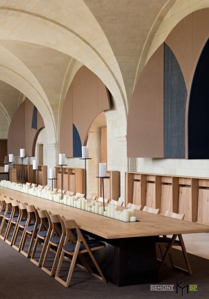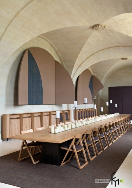 В центре зала, под крестообразным каменным сводом располагается длинный стол со светлой столешницей, окруженный со всех сторон множеством складных деревянных стульев.