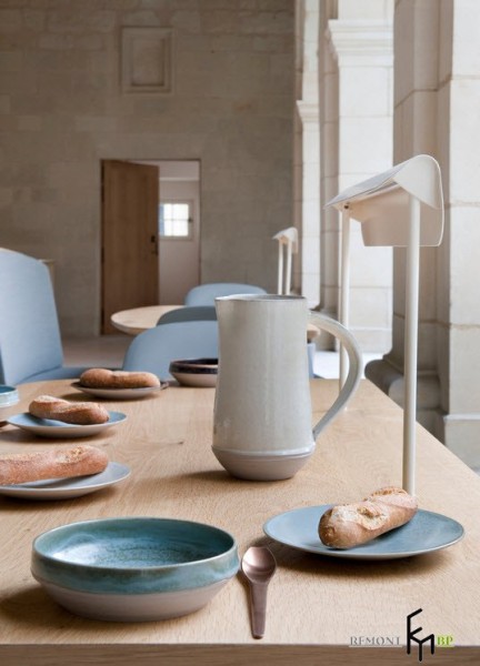 Полы в помещении монашеской столовой выложены светлой декоративной плиткой, и лишь в некоторых частях зала устланы ковровым тонким покрытием выразительного синего цвета.