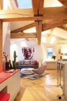 На верхних этажах находятся личные комнаты и одна из них – главная спальня. Серо-голубые тона отделки создают в помещении прохладную атмосферу. А вот текстиль и ковровое покрытие ручной работы «согревают» комнату теплом и уютом элементов сельской жизни. Безусловно, большая кровать с обильным текстильным декором, является не только центральным предметом мебели, но и фокусным центром спальни на мансарде.
