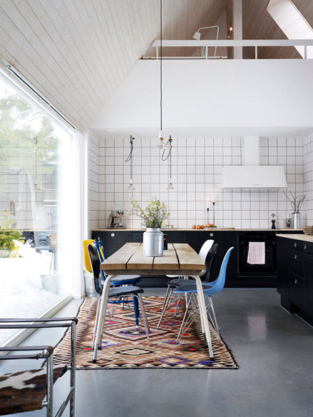 Расположенная здесь же столовая группа весьма условно зонирована с помощью яркого коврового покрытия, придающего этому функциональному сегменту уюта и домашнего тепла. Оригинальный стол со столешницей, сооруженной из нескольких досок, окружают разномастные стулья, выполненные не только в разных стилях, но и разнообразных расцветках. Яркий и позитивный образ столовой отлично смотрится на белоснежном фоне закрытого жалюзи окна. А в менее солнечную погоду можно наблюдать за пейзажем во время семейной трапезы.