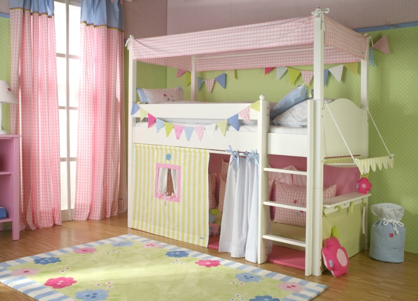 Что касается кровати, то здесь все индивидуально. Лучше выбирать средний размер, чтобы она не загромождала пространство. В случае, если маленькая спальня предназначена для двоих детей, то стоит задуматься о приобретении двухъярусной кровати. В основном на верхнем ярусе размещают старшего ребенка. Но все же, это не слишком принципиально. И если разница в возрасте у детей не большая, предоставьте им принимать это решение.