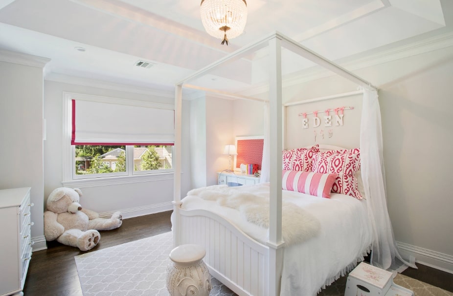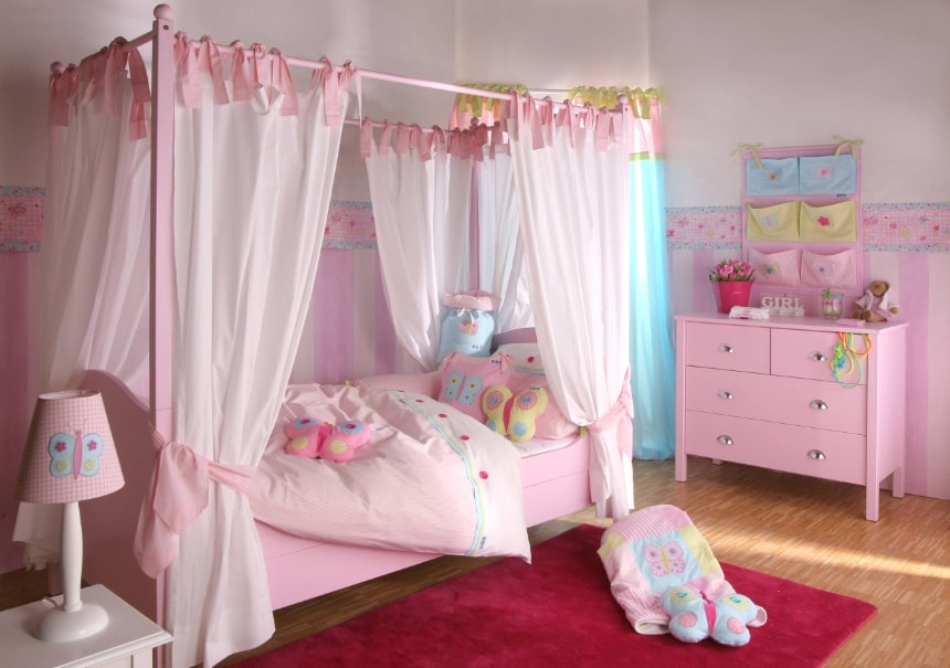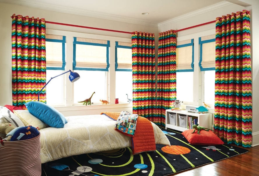 Немаловажную роль в оформлении детской спальни играет текстиль. Все потому, что именно он формирует ощущение тепла и уюта, что особенно важно в доме. Шторы, покрывало, ковер и подушки должны быть выбраны в одном стилистическом решении. Кроме того, рекомендуем остановить выбор на экологичных материалах. Что касается цвета, то он может повторять общее оформление спальни или же быть контрастным. В основном шторы выбирают в меру плотные, чтобы они не пропускали свет. При этом тюль лучше выбирать светлую, не плотную и без дополнительных деталей. Ведь пропускание света влияет на зрение ребенка во время работы над домашним заданием.