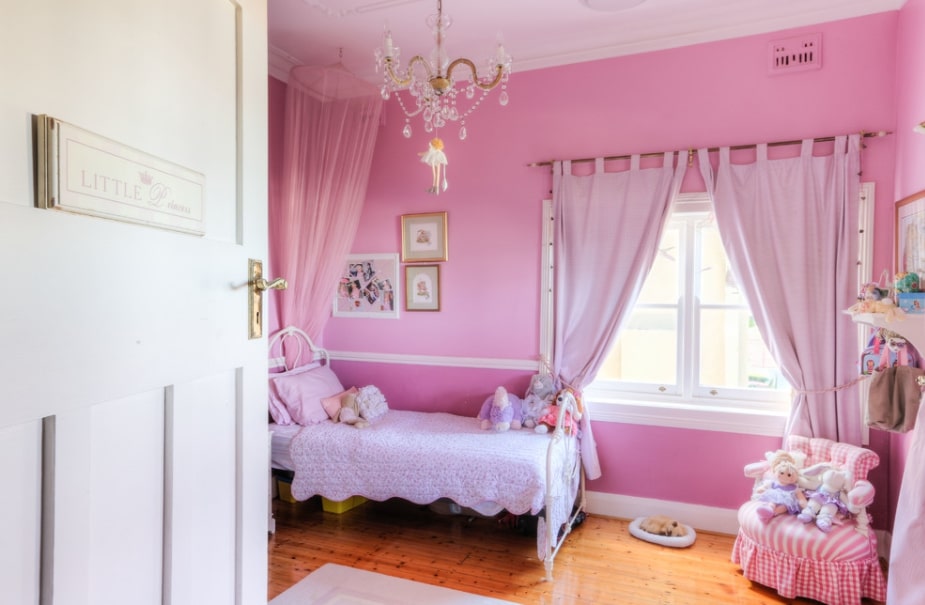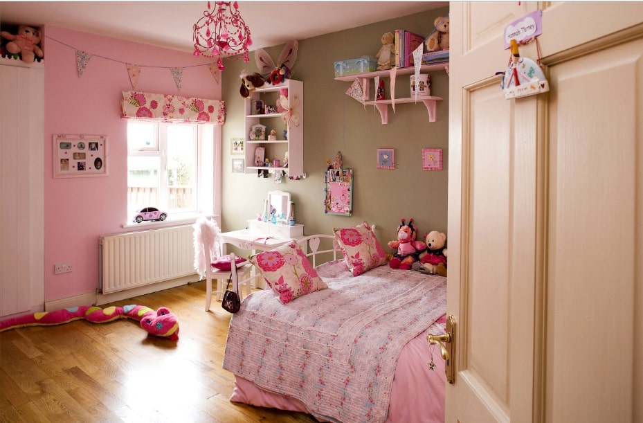 Немаловажную роль в оформлении спальни для детей играет цветовая гамма. Дизайнеры рекомендуют выбирать не слишком яркие тона, каждый из которых имеет собственное значение. В основном девочки предпочитают розовый, сиреневый, белый и желтый цвета. А мальчики, в свою очередь, преимущественно выбирают синий, голубой и фиолетовый оттенки. Пожалуй, самыми нейтральными являются бежевый и зеленый цвет, а также пастельная гамма. По мнению специалистов, от слишком ярких цветов стоит отказаться, поскольку они быстро наскучат и со временем могут начать раздражать. В последнее время популярностью пользуются нейтральные стены с более активным рисунком. Это могут быть кружочки, облака, животные, феи и даже супергерои. Главное, чтобы их было не слишком много.