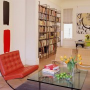 Декора в данном стиле используется минимальное количество, однако он всё же есть. Исключениями предстают большие картины с изображением города и небоскрёбов, высокие торшеры строгой лаконичной формы, большие напольные вазы, высокие зеркала и всевозможные металлические изделия. Роль украшений так же играют современные технологии и гаджеты. Не только в качестве декора, но и для зонирования пространства, также прекрасно подойдут стеклянные перегородки: прозрачные, матовые, оклеенные плёнкой и тонированные.