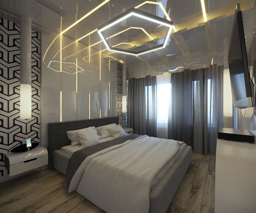 В пример можно привести множественные вертикальные стеклянные подвески или шарообразные плафоны из хрома, которые замечательно впишутся в интерьер. Обычно в данном стиле довольно востребовано зонирование пространства, соответственно распространено локальное освещение. Одними из таких осветительных приборов предстают торшеры, чаще высокие и дугообразные. В спальнях торшеры особенно хорошо смотрятся рядом с прикроватными тумбочками или креслами. Интересно выглядят настенные светильники различных геометрических форм, а настольные светильники прекрасно дополнят комнату в стиле новейших технологий.
