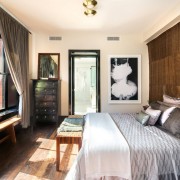 С помощью деревянной отделки акцентной стены и подвесных дверей, которые открываются по принципу гаражных ворот или сараев. Удалось привнести элемент сельской жизни в современный интерьер спальни с кабинетом.