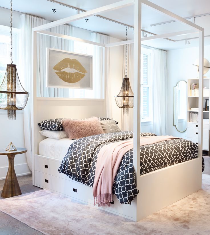 Помните, что кровать должна быть не только красивой, но и функциональной. Если у данной мебели есть дополнительный контейнер для постельных принадлежностей или ящиков, то она будет работать как место для хранения одежды и безделушек, которыми полна девичья спальня. Также постарайтесь купить матрас, который гарантирует молодому организму здоровый сон.