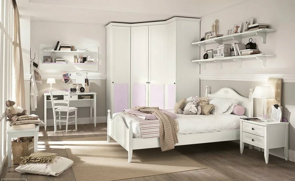 Спальня для девушки: кровать, туалетный столик, шкаф, аксессуары