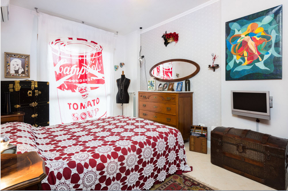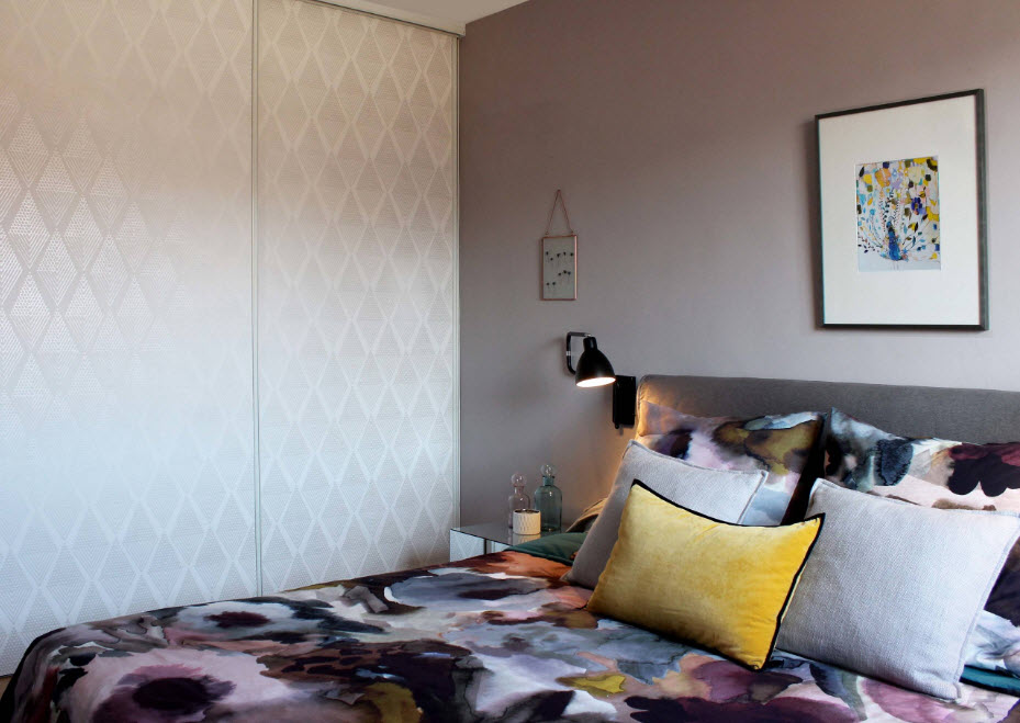 Большинство дизайн-проектов спален средних размеров представляют собой помещения, оформленные в светлых, пастельных тонах, как правило, в однотонных вариациях. В таком случае роль акцентных пятен играет декор – настенный, текстильный и прочий. На светлом фоне стен акцентно смотрятся даже художественные работы и фотографии, выполненные в пастельных тонах. Красивая картина, семейный портрет, оригинальное панно или реликвия нескольких поколений – старинный гобелен, станут прекрасным украшением и при этом не займут места.