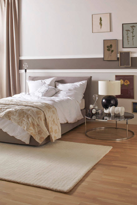 Одним из самых популярных вариантов оформления полов в спальне для наших соотечественников остается ламинат. Богатство расцветок, искусная имитация древесины различных пород и возможность монтажа напольного покрытия самостоятельно привлекает многих владельцев квартир и частных домов. Безусловно, говорить о высокой экологичности материала, в состав которого входят синтетические склеивающие смолы, не приходится. Зато и цена существенно ниже природного материала, а внешние декоративные качества не уступают натуральной облицовке.
