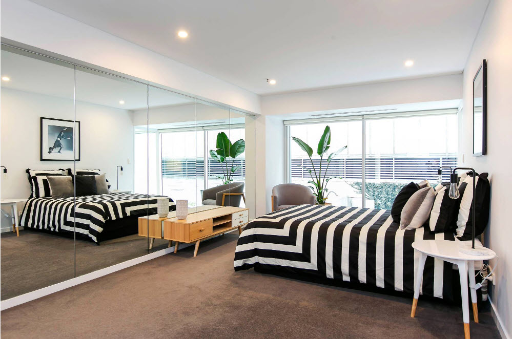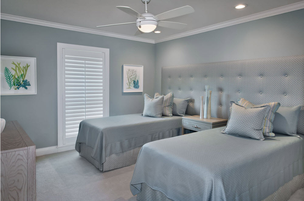 В спальнях, рассчитанных на две кровати, приходится зонировать сами спальные сегменты. Площадь комнаты позволяет эргономично располагать кровати – таким образом, чтобы подход к каждой из них был доступен со всех сторон. Лучше «пожертвовать» одной прикроватной тумбой, установив между двумя кроватями общий столик-подставку, чем придвигать спальное место к стене.