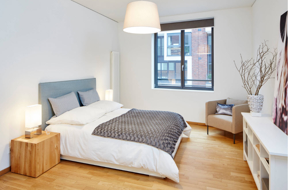 Используя минималистские настроения современной стилистики, удается создать ощущение простора и свободы даже в помещениях средних размеров, таких как спальни в 15-16 кв. м. Традиционная планировка, использование легкой по дизайну дополнительной меблировки и отсутствие напольного декора позволяет не только создать пространство для свободного трафика, но и придать помещению определенный характер.