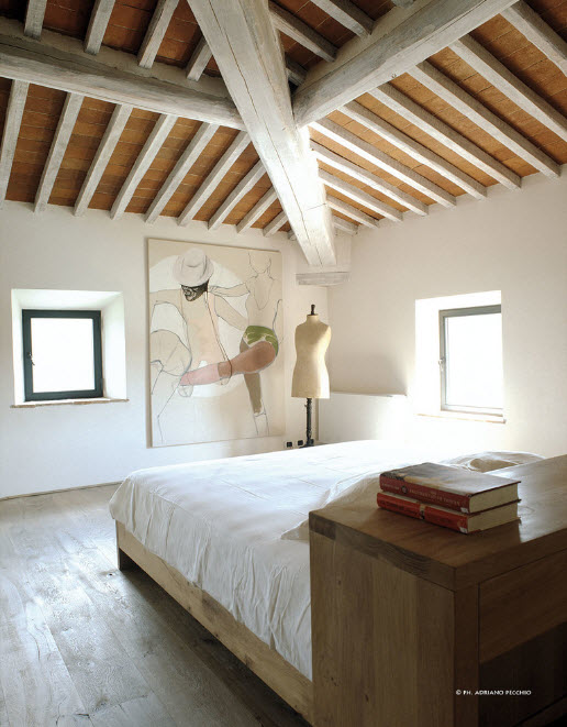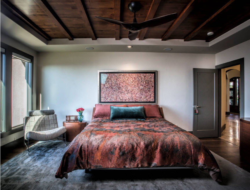 Использование потолочных балок в современных спальнях уже давно перестало быть изюминкой только зарубежных дизайн-проектов, многим нашим соотечественникам приходится по вкусу идея привнесения природной теплоты и уюта в интерьер городских апартаментов. Для создания интересного оформления потолка можно использовать древесину локально – только для балок или применить в качестве основы потолочную плитку из натурального материала или его достойного искусственного аналога. В любом случае, оформление получается достаточно колоритным, акцентным, поэтому остальную отделку поверхностей спальни лучше выдержать в спокойных светлых тонах и желательно в однотонных вариациях.