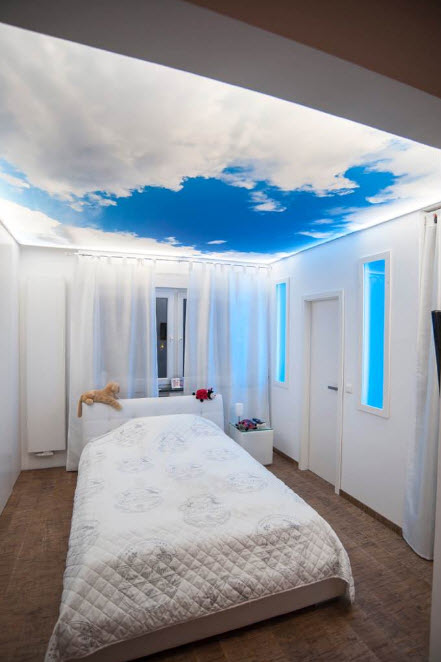 Для тех, кто хотел бы получить быстрый результат по оформлению потолков и не разводить грязь и пыль по всему помещению, идеальным вариантом может стать использование натяжных конструкций. Преимуществом такого способа отделки потолка является отсутствие необходимости в выравнивании поверхности. Сатиновую, матовую или глянцевую пленку вам смогут натянуть на потолок даже с существенными перепадами уровней в места стыковки бетонных плит. При этом необходимо учесть, что на установку профиля, к которому будет крепиться пленка, понадобится некоторое расстояние, а значит, высота вашей спальне немного уменьшится. Еще одним недостатком подобного дизайна потолка является то, что выполнить его самостоятельно практически невозможно – необходимо специальное оборудование для нагрева пленки ПВХ и определенная сноровка по ее натягиванию на профиль.