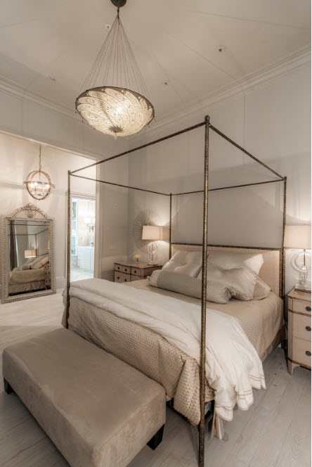 Стиль шебби шик буквально создан для того, чтобы найти воплощение в интерьер спальни. Использование старинной мебели с потертыми поверхностями (или искусственное состаривание современных моделей), обилие текстиля, различных оборок и кружев, цветочный принт на обоях и тканях, вензели на подсвечниках и кованый декор на металлических изголовьях кроватей – в сочетании с современными отделочными материалами предстает в необычном, но очень уютном исполнении интерьера спальни.