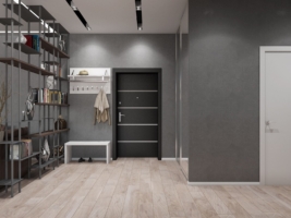 В просторной спальне частного дома может находиться полноценная гардеробная. При правильном расположении она не потеряет свой размер. Вместо того, чтобы вставлять шкаф-купе с углублением, установите статическую перегородку с отдельным входом для хранилища вещей. Ставка на серые тона, мягкую кровать с изголовьем и светлый пол придаст спальне интересные нотки.