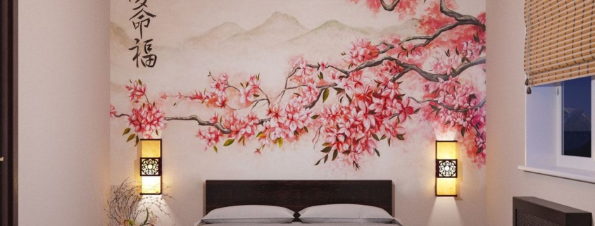 Если вы хотите сослаться на японскую эстетику в декоративном стиле, то можете соблазниться оригинальной настенной росписью. Такой элемент может в корне изменить интерьер спальни и добавить в нее характер за несколько минут. Японские жанровые сцены, восточные пейзажи, экзотические растения, гирлянды и пагоды могут располагаться на стенах. Очень модный акцент — мотивы птиц, особенно журавлей, которые очень часто появляются в геральдике Японии и в широком искусстве Дальнего Востока.