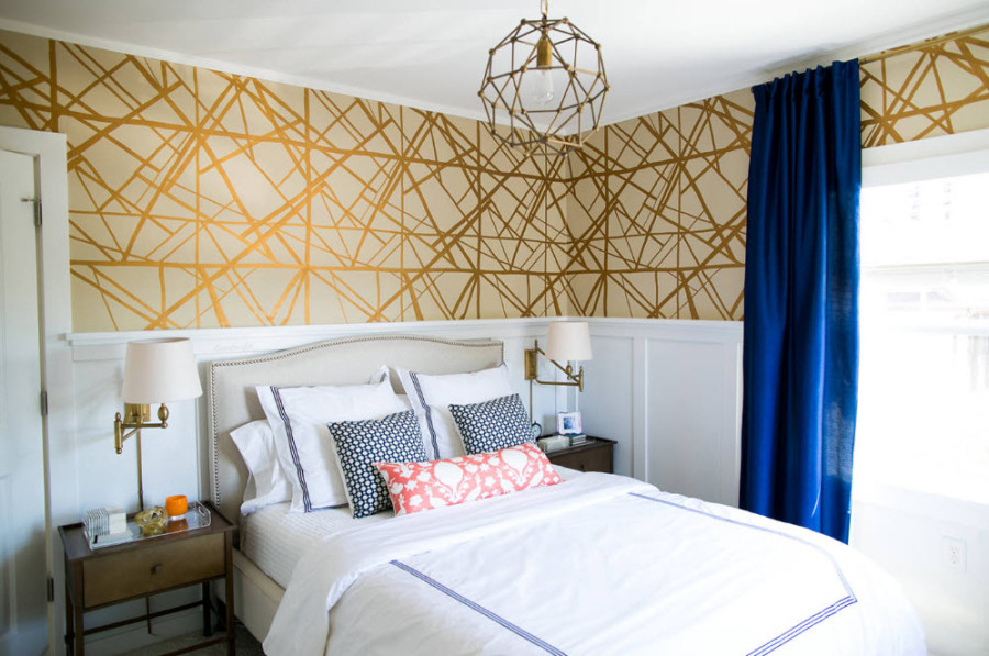 Если вы решили использовать принт в качестве акцента для выделения одной из стен спальни, то остановите свой выбор на геометрическом рисунке или абстракции. Например, полоска вновь стала использоваться для визуального расширения пространства. Горизонтальная полоса зрительно увеличит ширину комнаты, вертикальная – ее высоту.