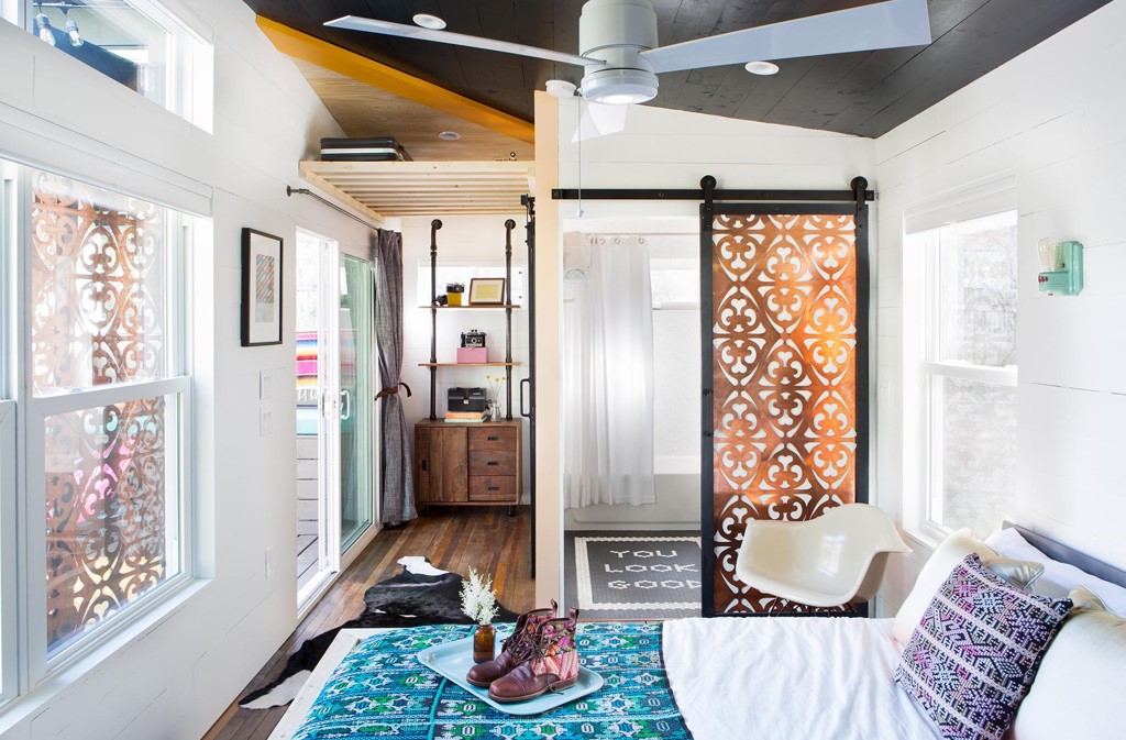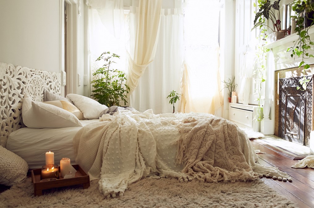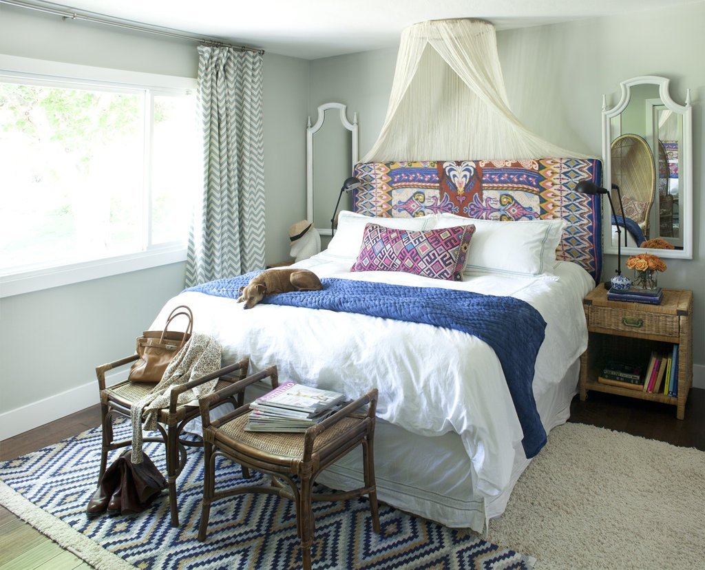 Стиль бохо приветствует вышеупомянутую многослойность, поэтому в одном спальном интерьере можно встретить мех, шерсть, бамбук, рогожку, шелк.