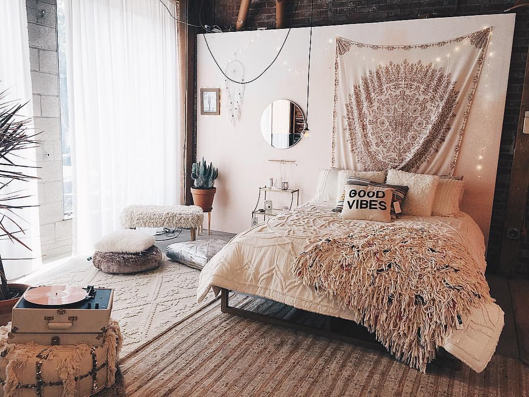 Для спальни в стиле бохо отлично подойдет матрас на полу, покрытый небрежно брошенным пледом. Если же все-таки кровать подобрана, то обязательно дополните её просторным постельным бельем, большим покрывалом, которые будут вальяжно и свободно спускаться с нее на пол.