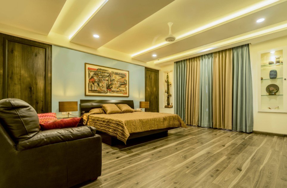 - Шторы в золотистой спальне
