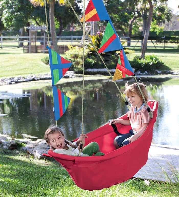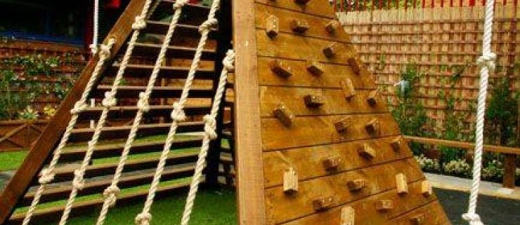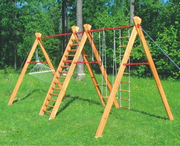 - Другим предложением могут быть дополнительные устройства, например, качели или лесенки, по которым ребенок будет подниматься вверх и вниз. Это версия для дачи с довольно большим пространством.