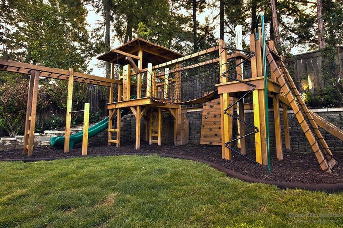 Разработанная игровая площадка должна быть адаптирована к возрасту ее пользователей. В случае с очень маленькими детьми вы можете установить дополнительную скамью для крохи. В варианте детей постарше, вы можете создать площадку в месте, видимую с кухни или с террасы на заднем дворе. Выбранная горка, турники, лестницы, домик должны иметь соответствующие разрешения и быть установлены в с принципами безопасности.