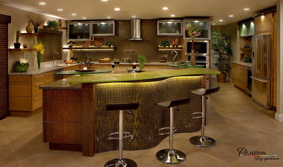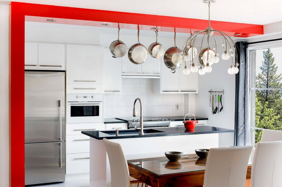Стеклянные элементы легко вписываются в любую обстановку. Особенно, если ее дополнить другими деталями из стекла: полочками, фартуком над рабочей поверхностью, стеклянными панелями для стен и другими.