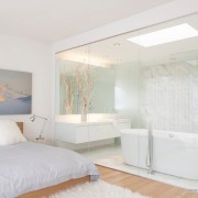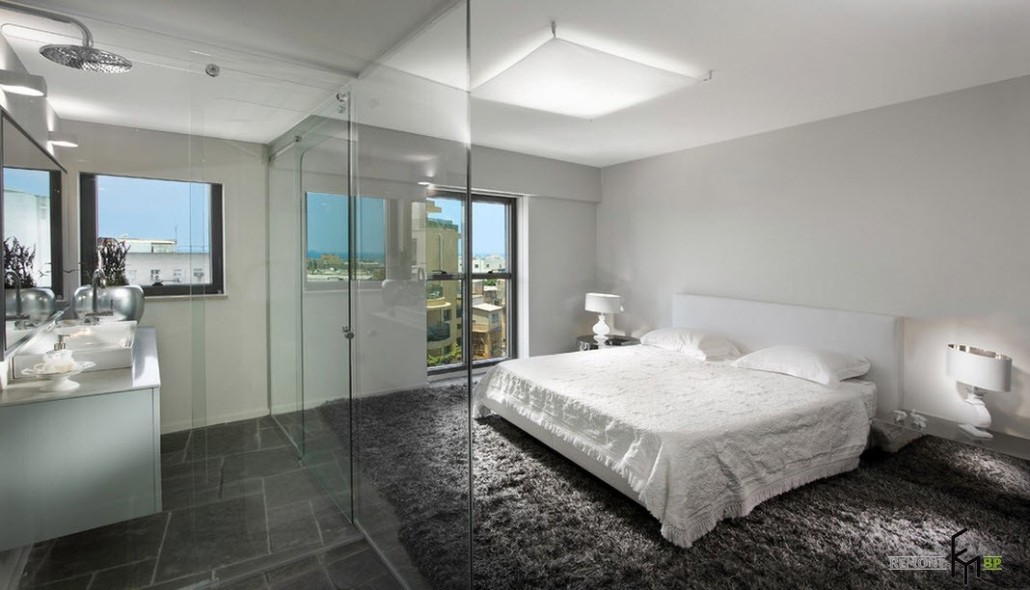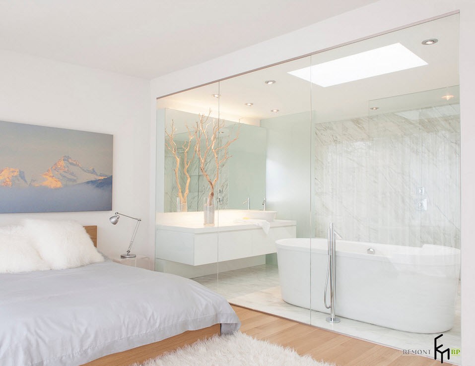 Ванная, совмещенная со спальней – мечта многих из нас, порой несбыточная, ведь в квартире, где проживает семья с детьми совершенно нерационально делать ванную со входом со спальни родителей, однако если есть возможность обустроить санузла или дети пока еще не планируются, то стеклянная перегородка между спальней и уборной – отличное решение.