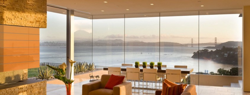 Раздвижная или распашная стеклянная дверь, вмонтированная в стеклянную стену, может быть установлена как внутри помещения, так и в качестве огромной стеклянной конструкции с выходом на улицу.