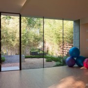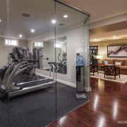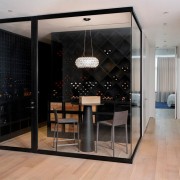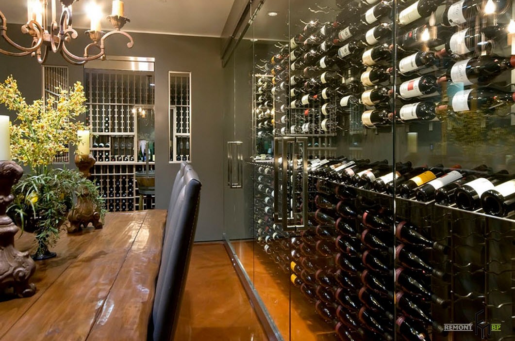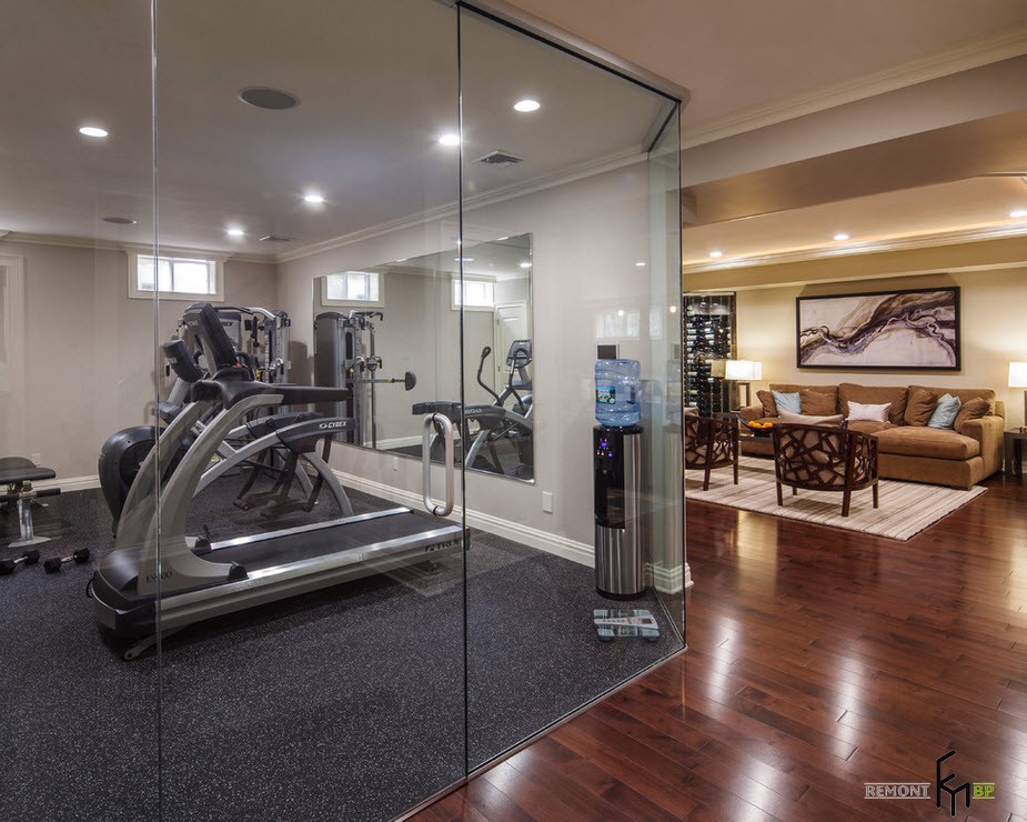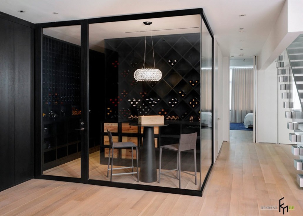 Стеклянные перегородки в квартире могут быть использованы и для обустройства в квартире места для имитации винного погреба или мини спортзала. При оформлении места для занятий нужно позаботиться о хорошей вентиляции и о максимальной герметичности стеклянной конструкции.