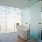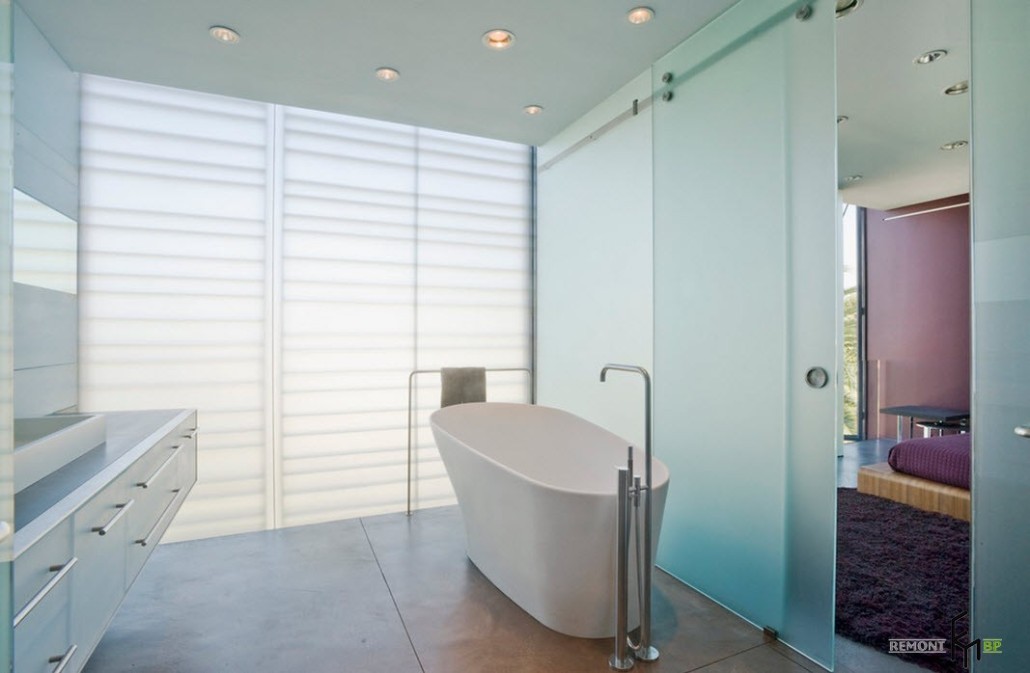 Здесь можно сделать как прозрачную, так и матовою стеклянную перегородку с раздвижной дверью. И в том и в другом случае интерьер будет очень интересным и функциональным.