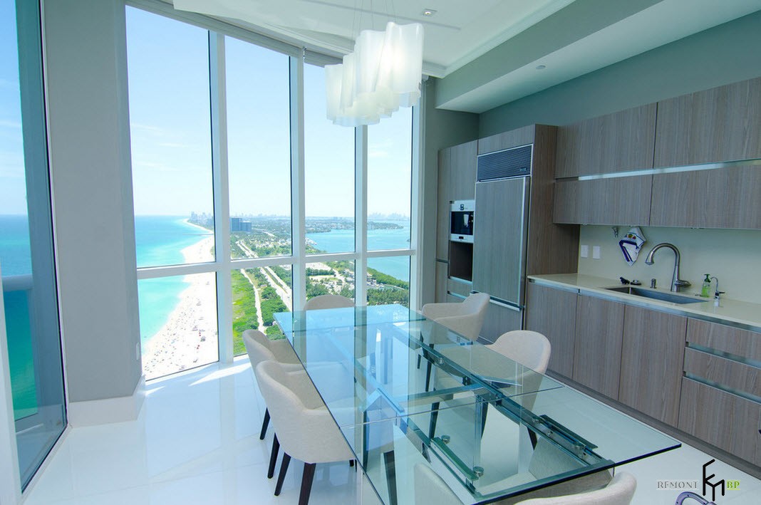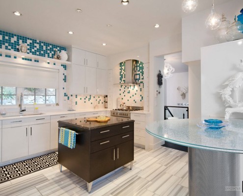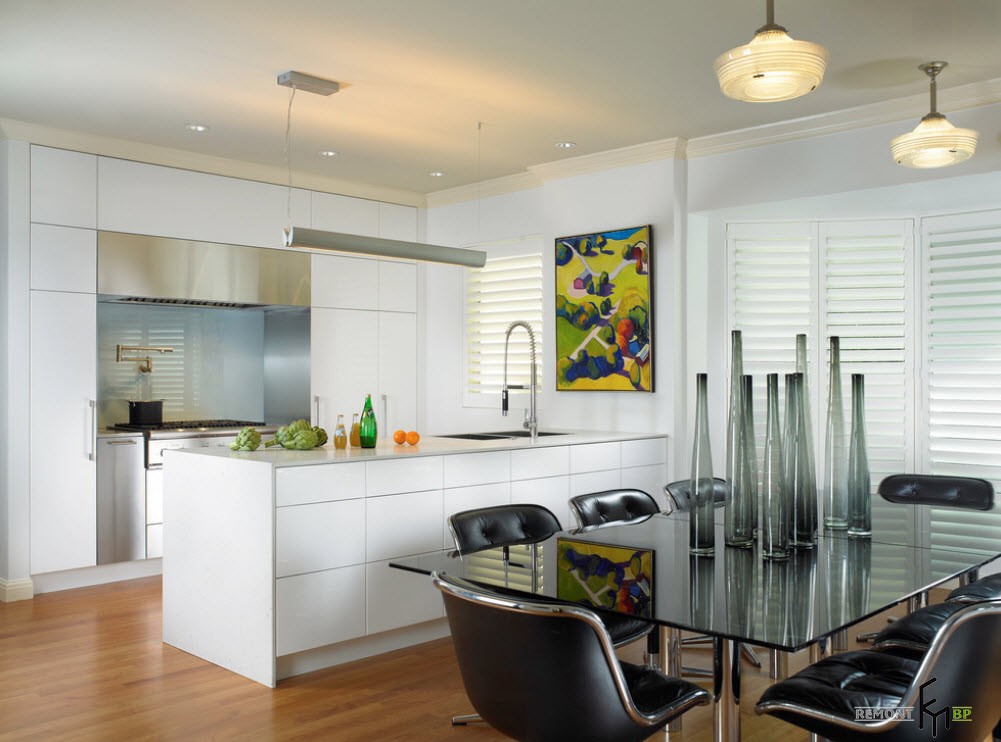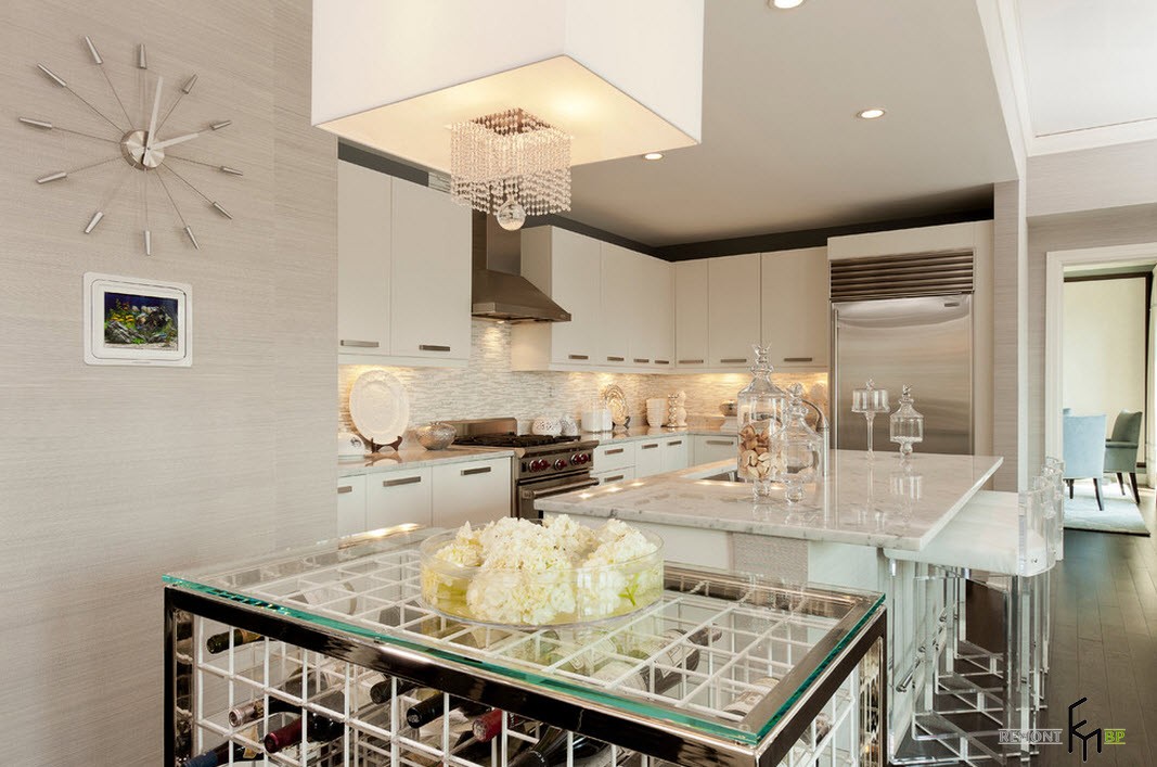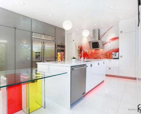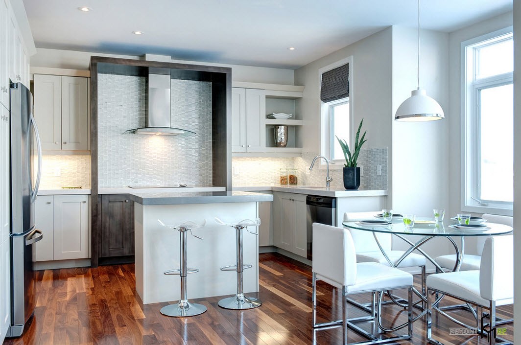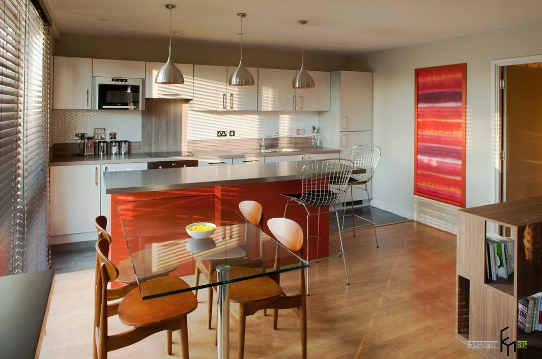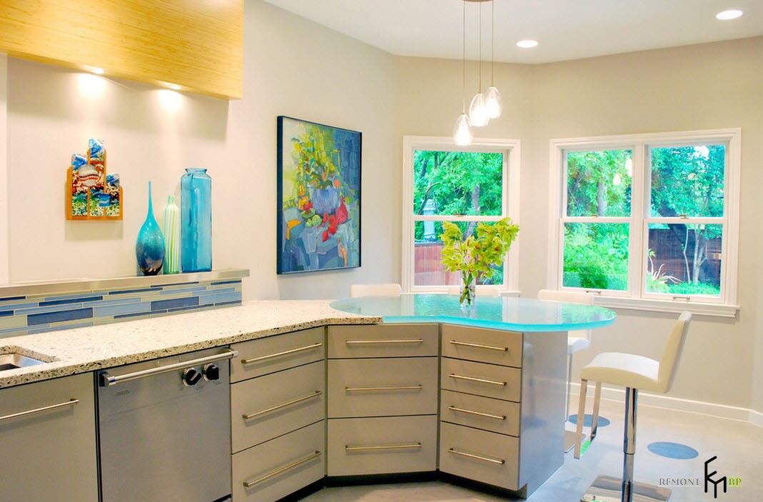 Прозрачная и белая столешницы легко адаптируюся под любой дизайн и более привычные глазу. Варианты распространенные, однако, не единственные. Бирюзовый, оранжевый и другие колоритные тона удобных кресел великолепно смотрятся в периметре кухни.